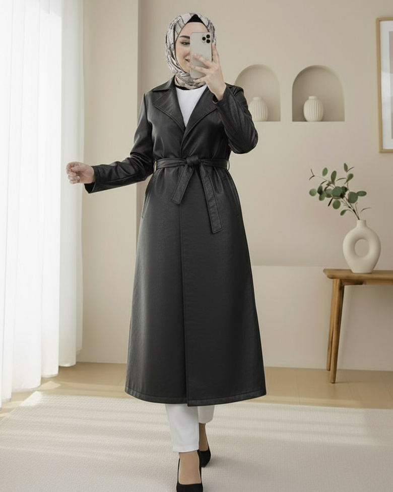 Beli Kemerli Yan Cebli Tek Düğmeli Deri Trençkot -Siyah-siyah