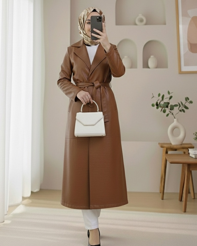 Beli Kemerli Yan Cepli Tek Düğmeli Deri Trençkot -Taba-Taba