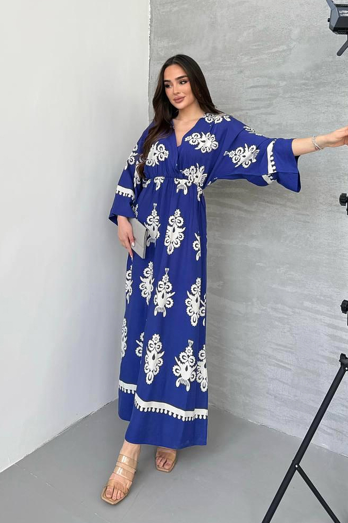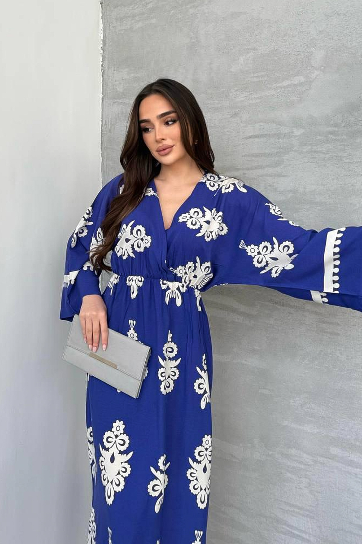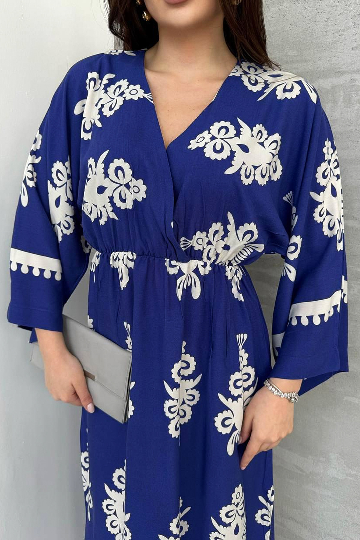 Yırtmaç Detaylı Yarasa Kol Kruvaze Yaka Uzun Yazlık Elbise-Saks