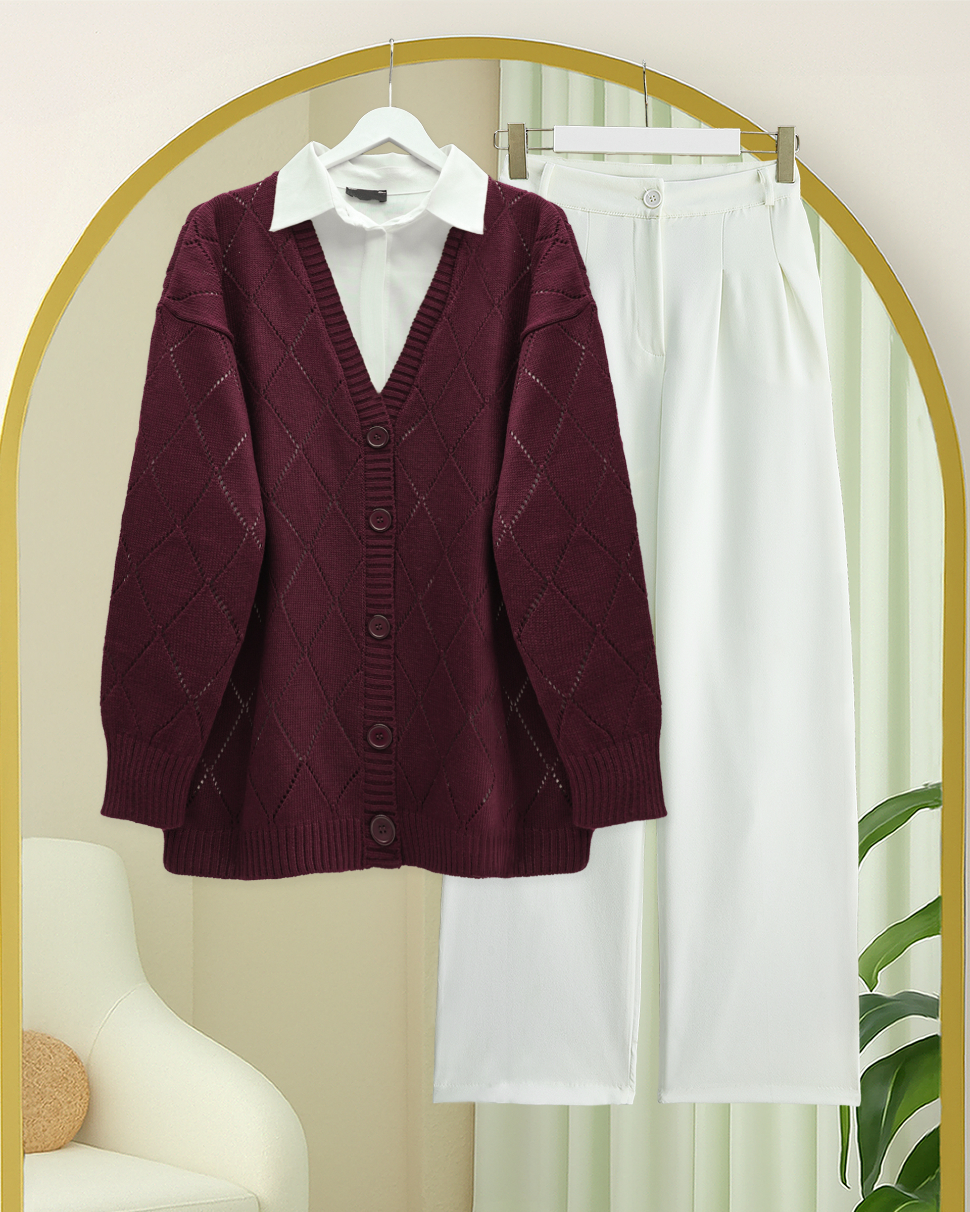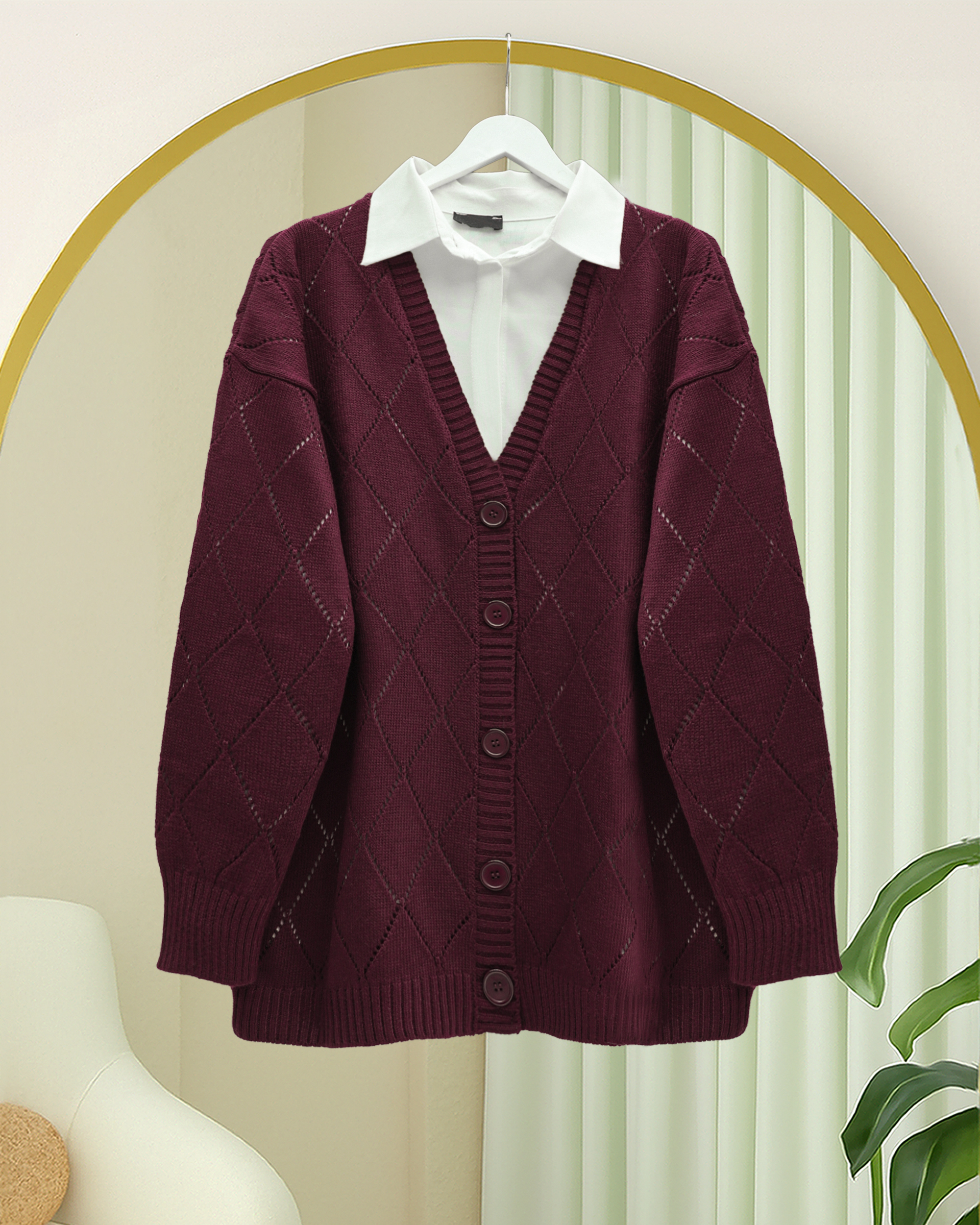 Ajurlu Baklava Desenli Triko Hırka -Bordo-Bordo