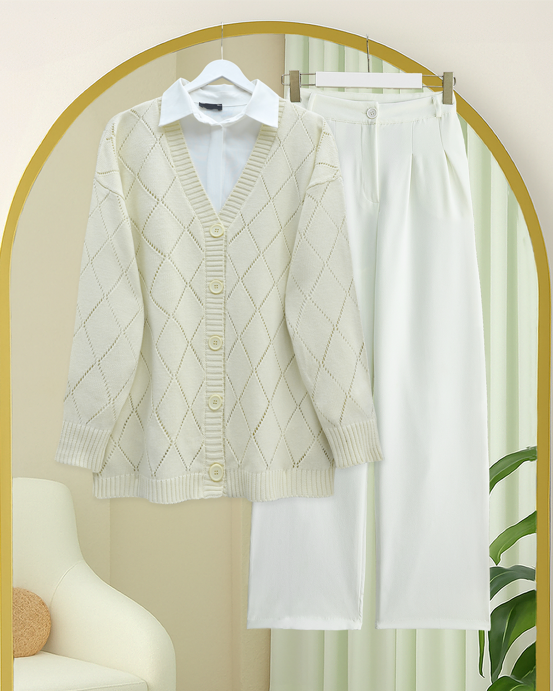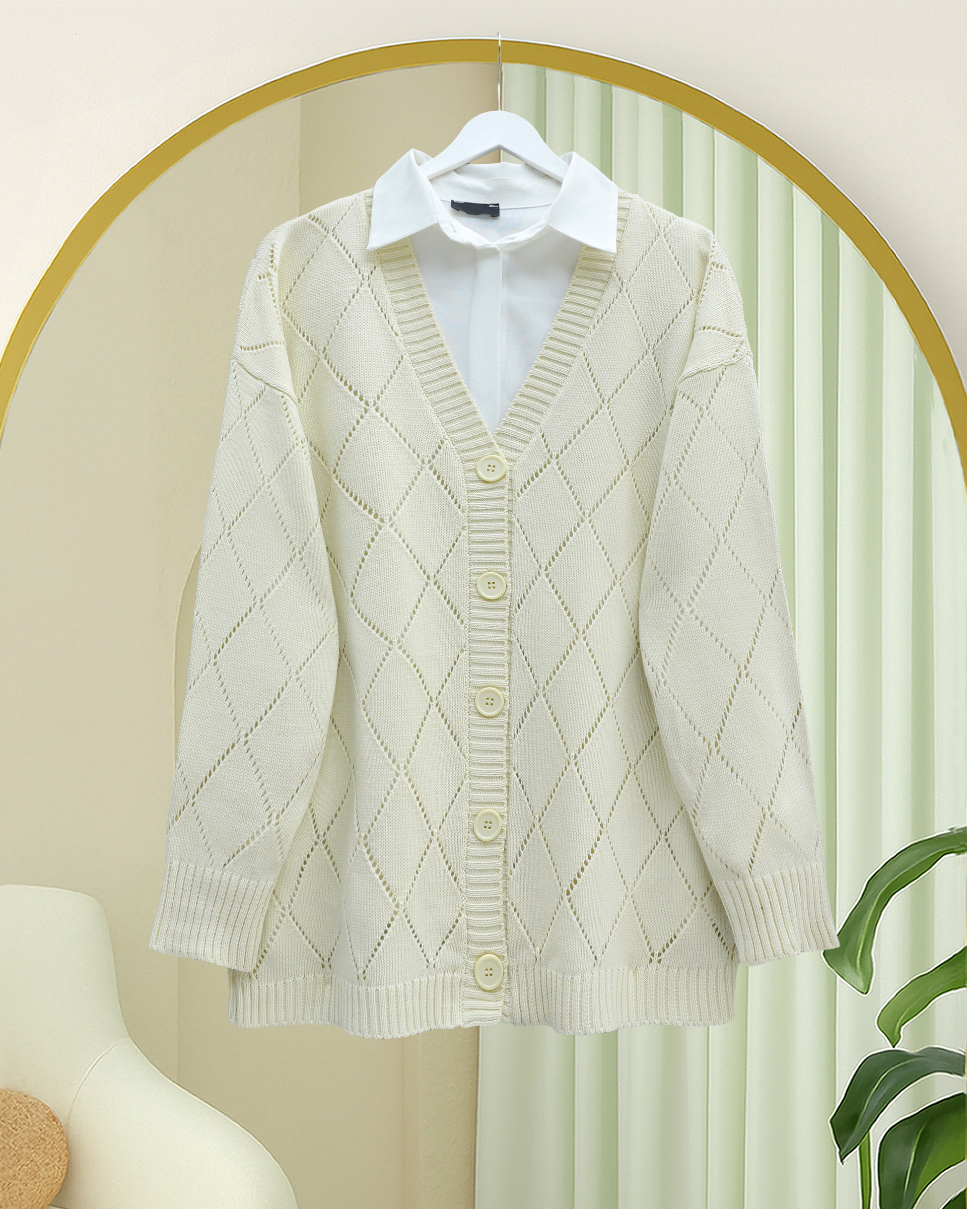Ajurlu Baklava Desenli Triko Hırka -Krem-Krem