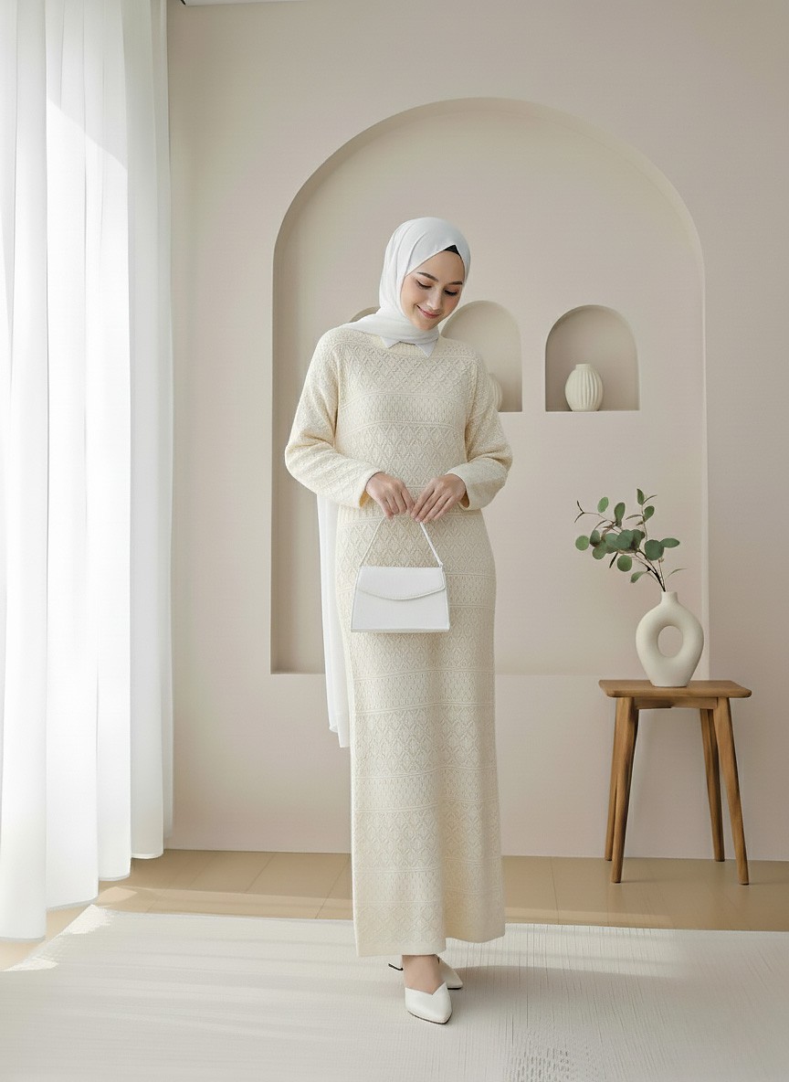 Ajurlu Desenli Triko Elbise -Ekru-Ekru