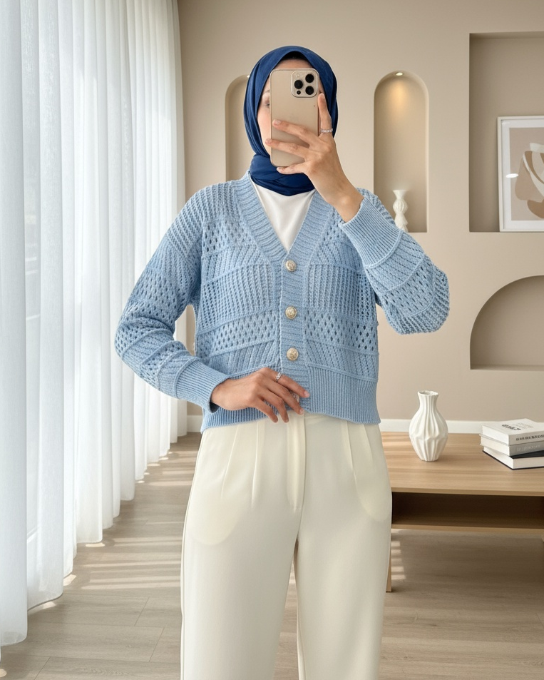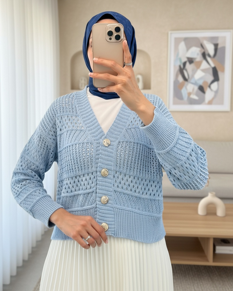 Ajurlu Düğmeli Triko Hırka -Bebe Mavi-Bebe Mavi