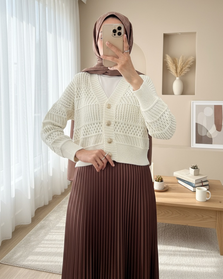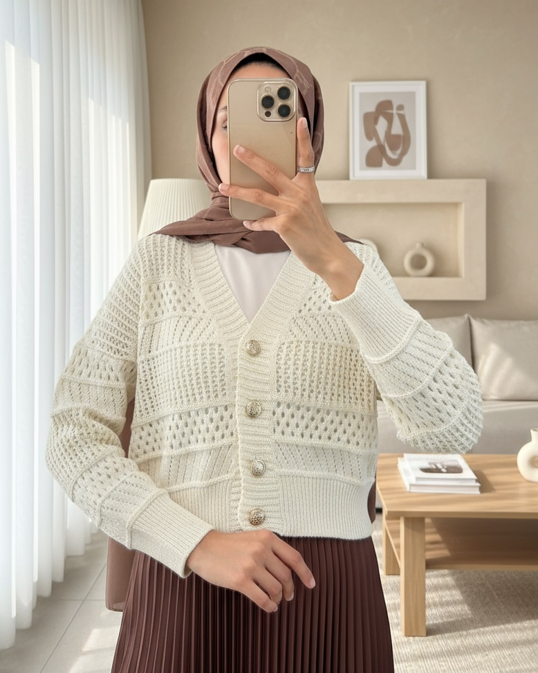 Ajurlu Düğmeli Triko Hırka -Krem-Krem