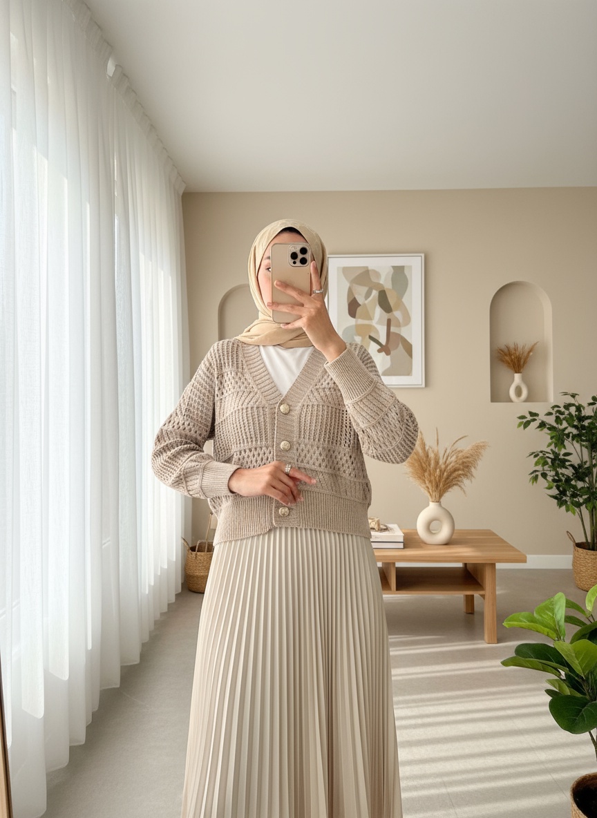 Ajurlu Düğmeli Triko Hırka -Vizon-Vizon
