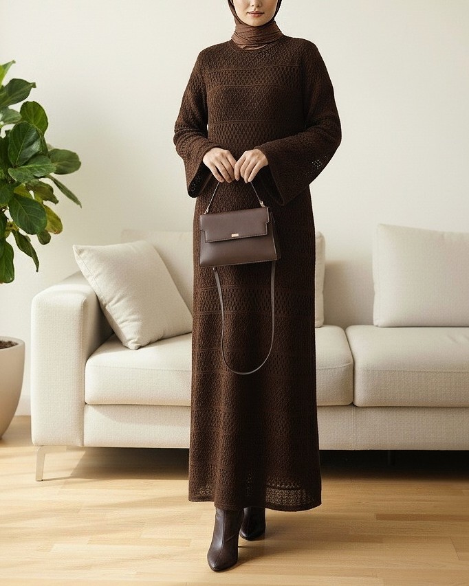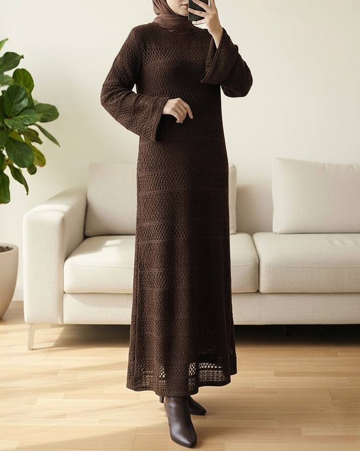 Ajurlu Karışık Desenli İçlikli Triko Elbise -Kahve-Kahve