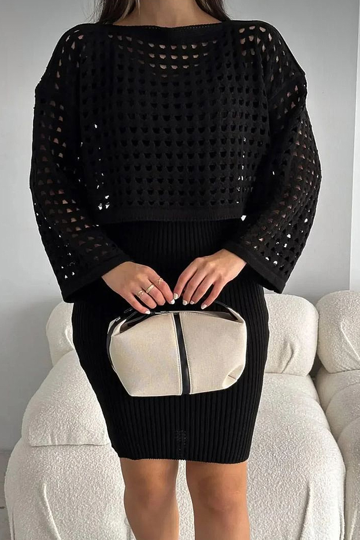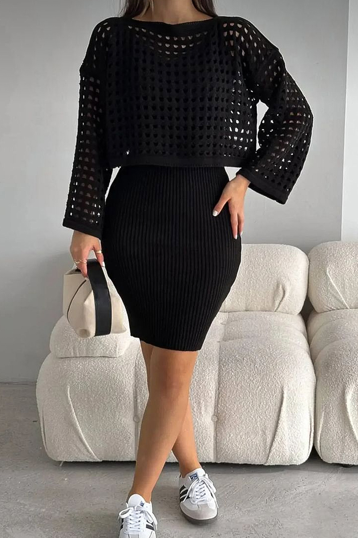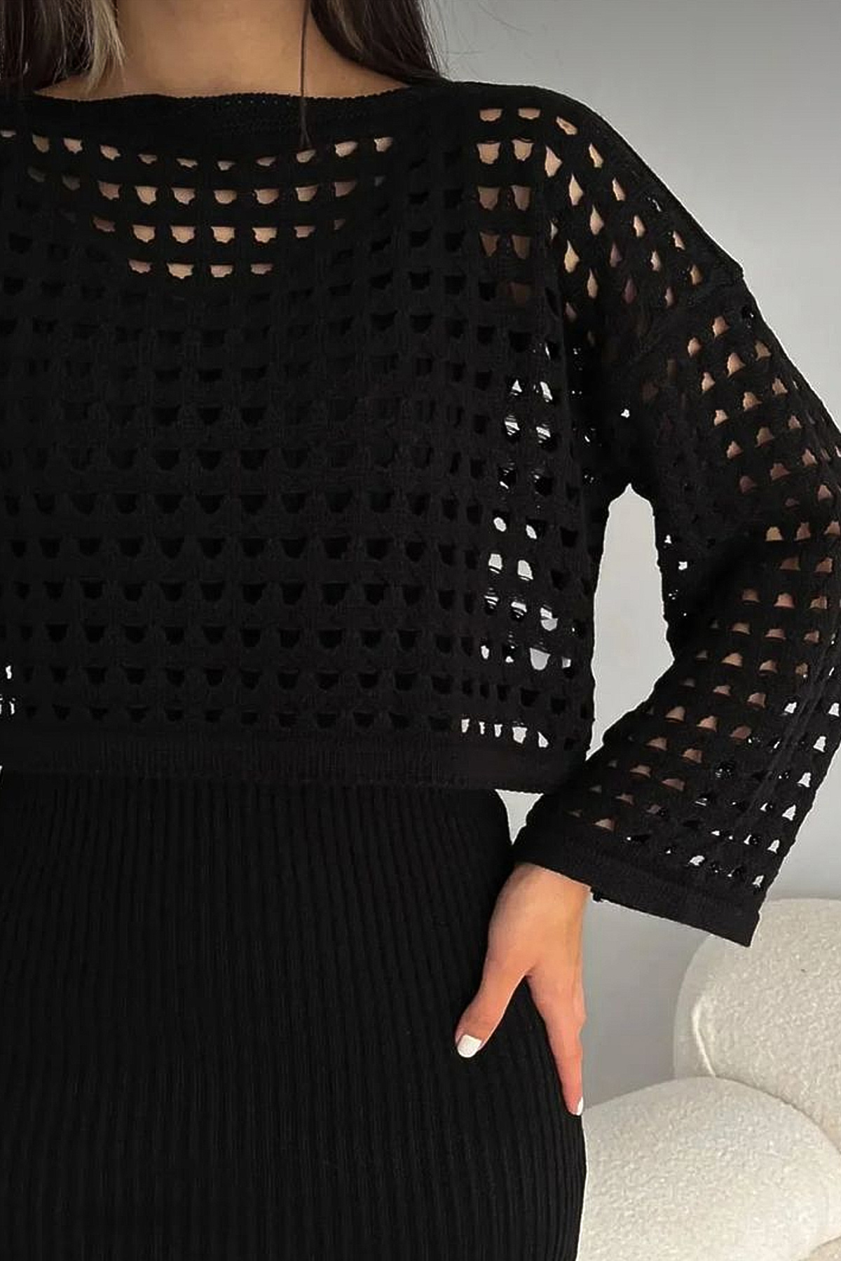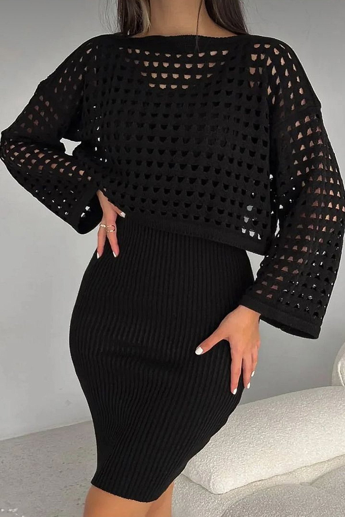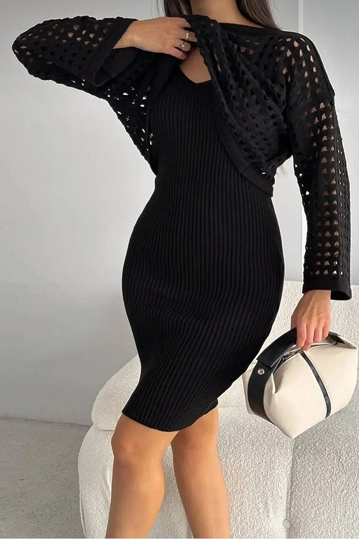 Ajurlu Kazak Askılı Triko Elbise Takım-Siyah