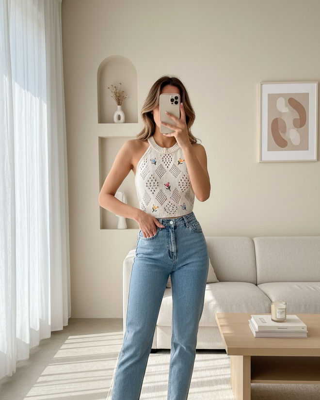 Ajurlu Nakışlı Sıfır Kol Triko Crop -Krem-Krem