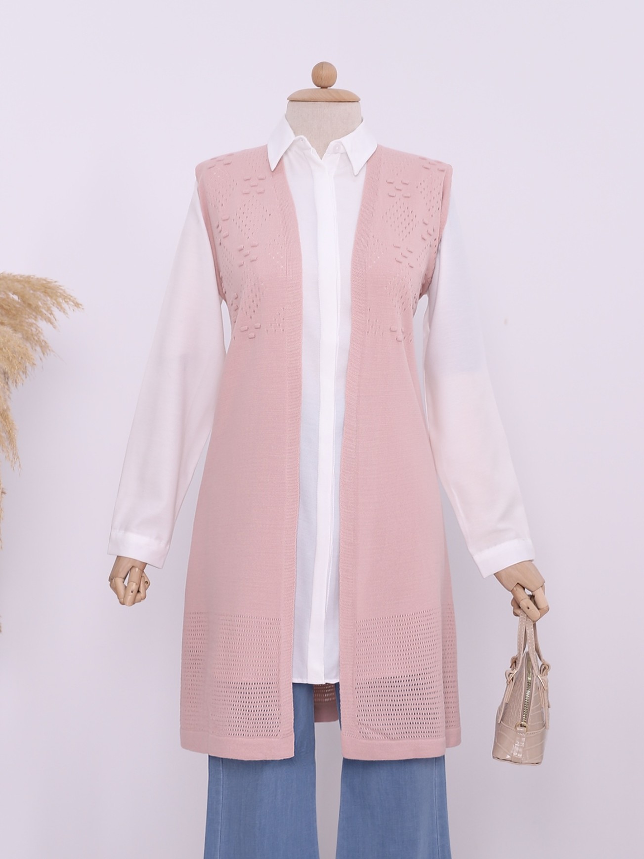 Ajurlu Ponponlu Araboy Triko Yelek -Pudra-Pudra