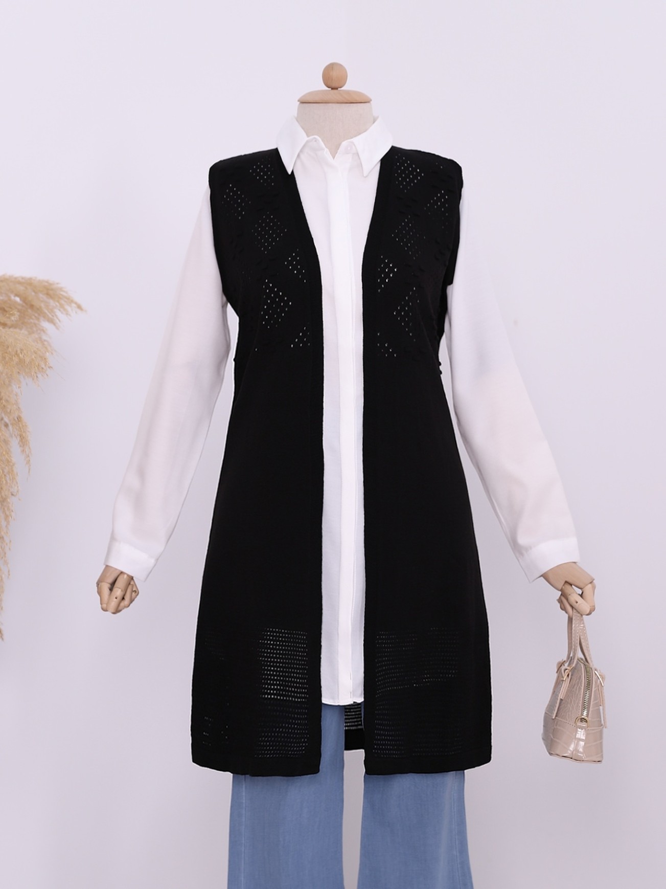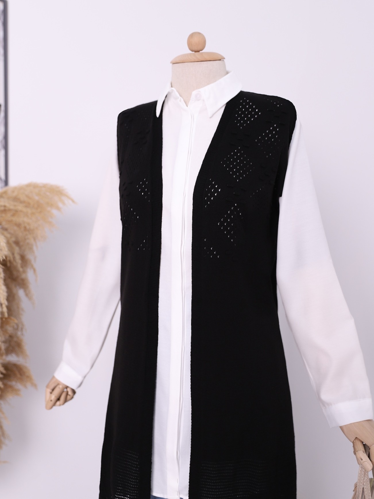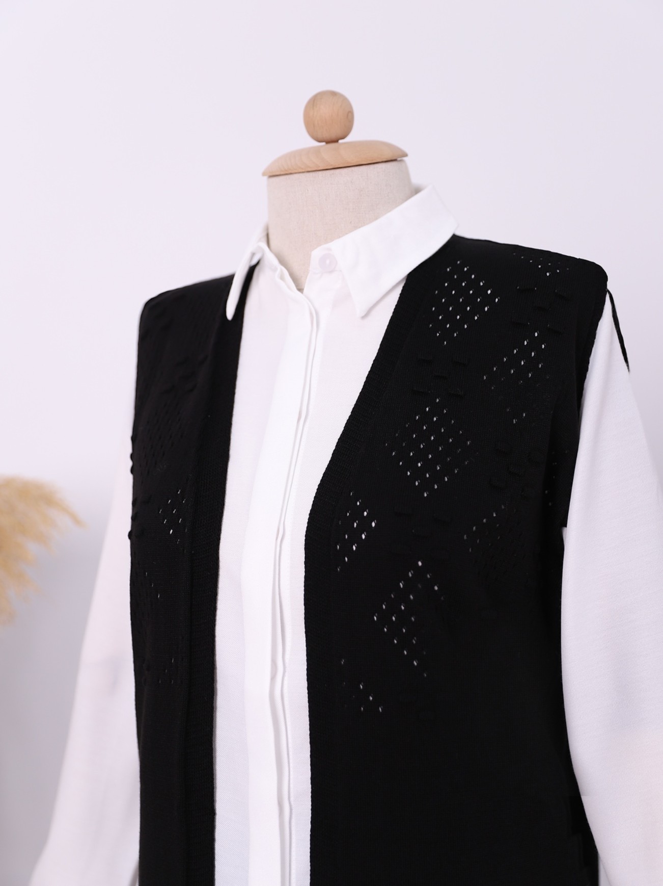 Ajurlu Ponponlu Araboy Triko Yelek -Siyah-siyah