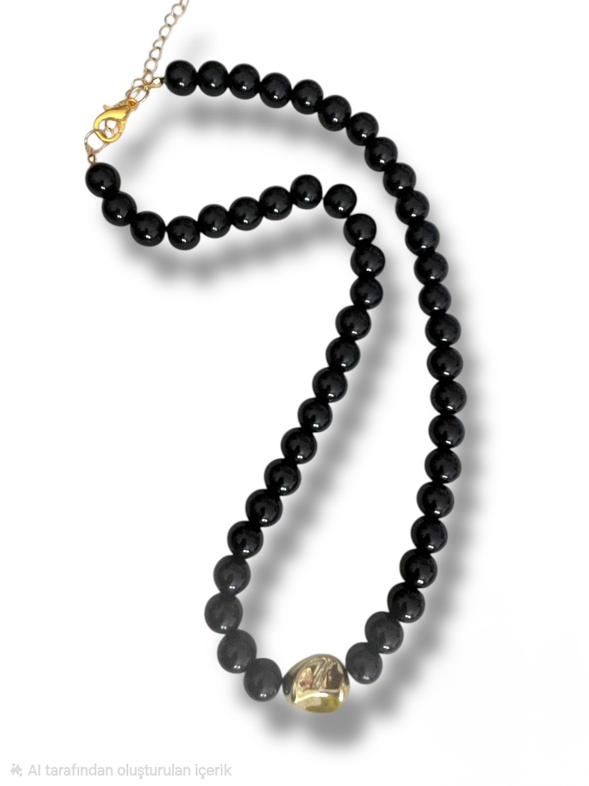 Altın Uçlu Siyah İnci Kolye -Siyah-siyah