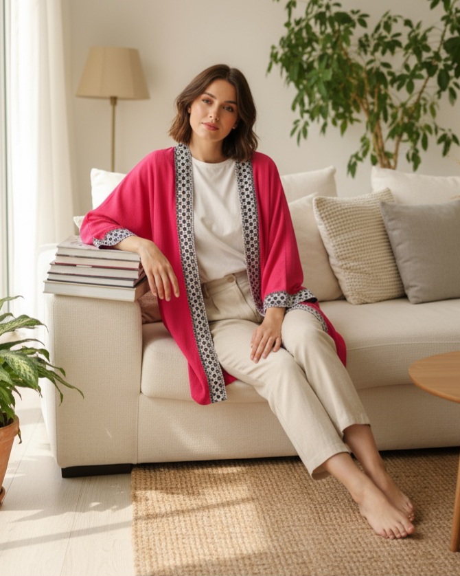 Araboy Etnik Şeritli Kimono -Fuşya-Fuşya