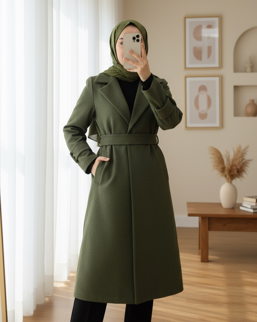 Arkası Bolero Detaylı Kemerli Kaşe Kaban -Haki-Haki