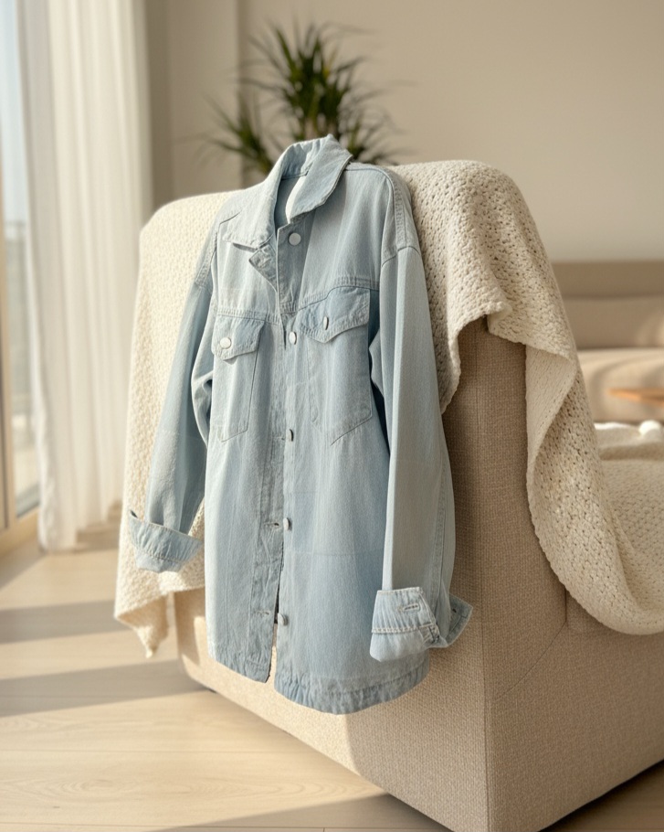 Arkası Uzun Desenli Düğmeli Kot Ceket -Buz Mavi-Buz Mavi