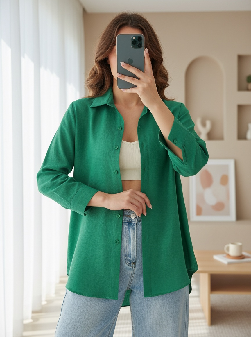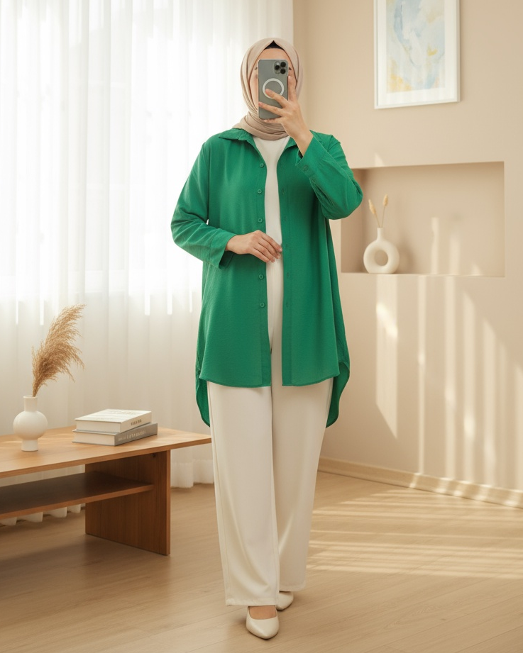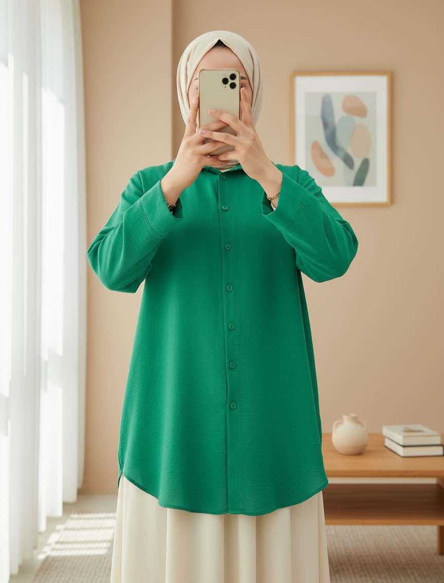 Arkası Uzun Düğmeli Poplin Gömlek -Yeşil-Yeşil