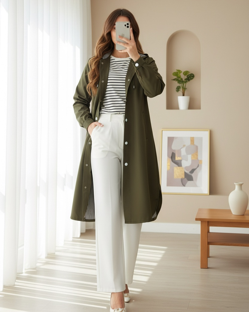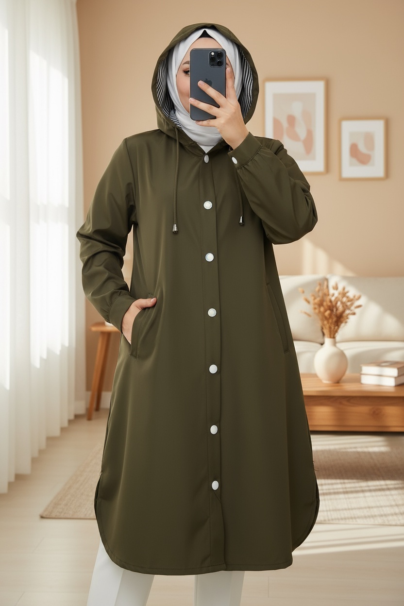 Astarı Çizgili Yan Cepli Kapşonlu Trençkot -Haki-Haki