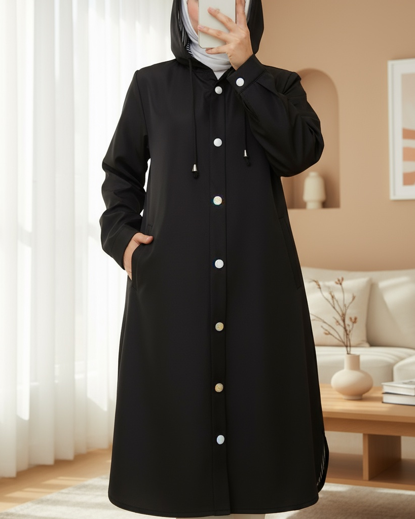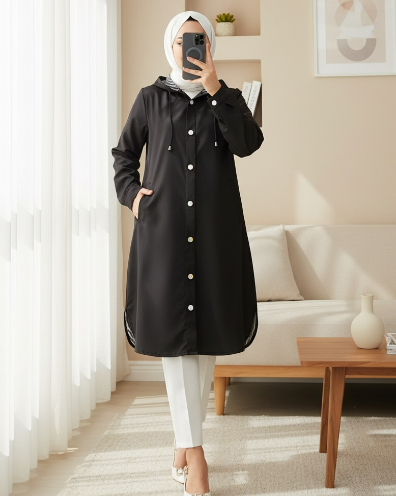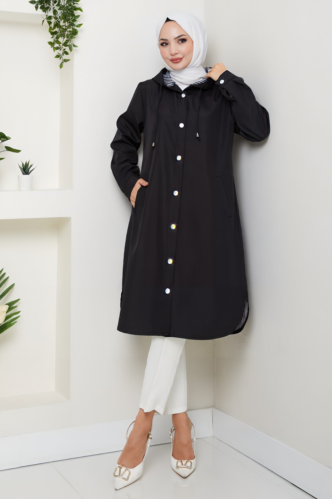 Astarı Çizgili Yan Cepli Kapşonlu Trençkot -Siyah-siyah