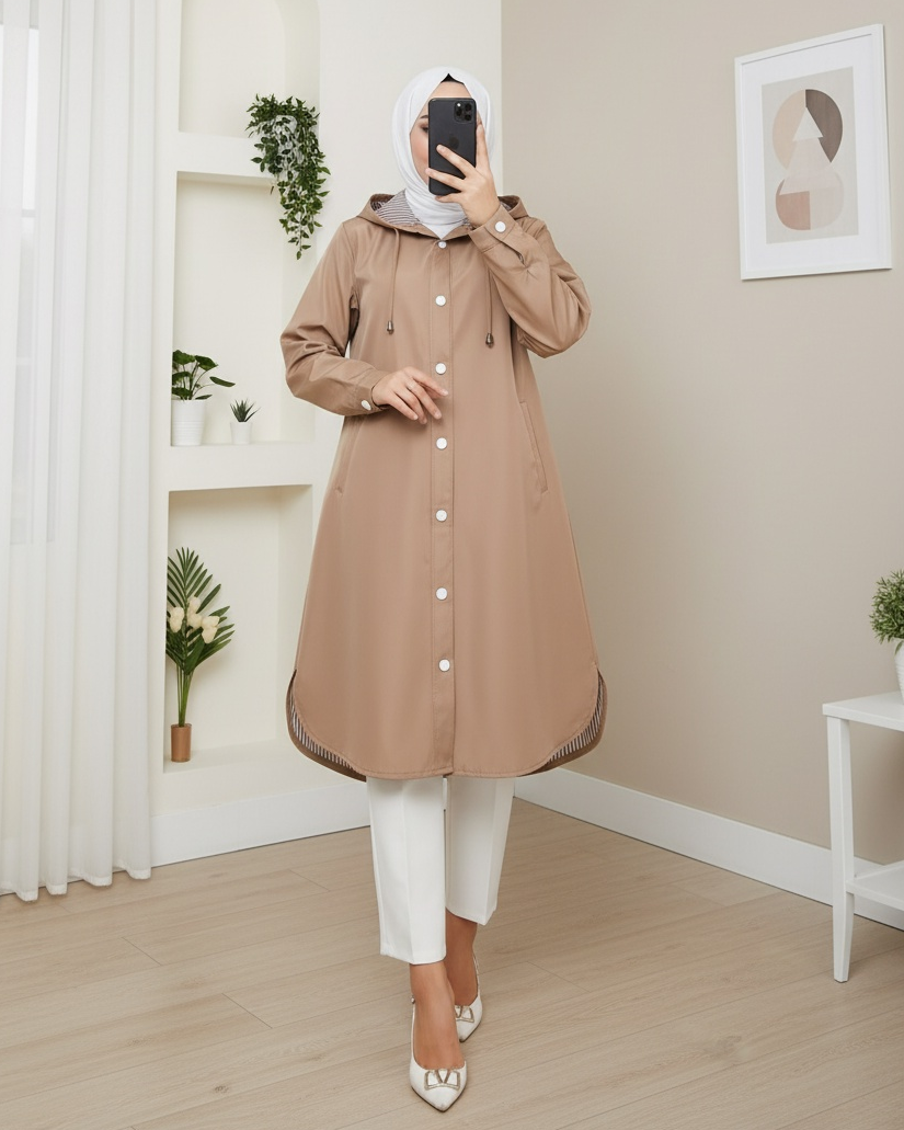 Astarı Çizgili Yan Cepli Kapşonlu Trençkot -Vizon-Vizon