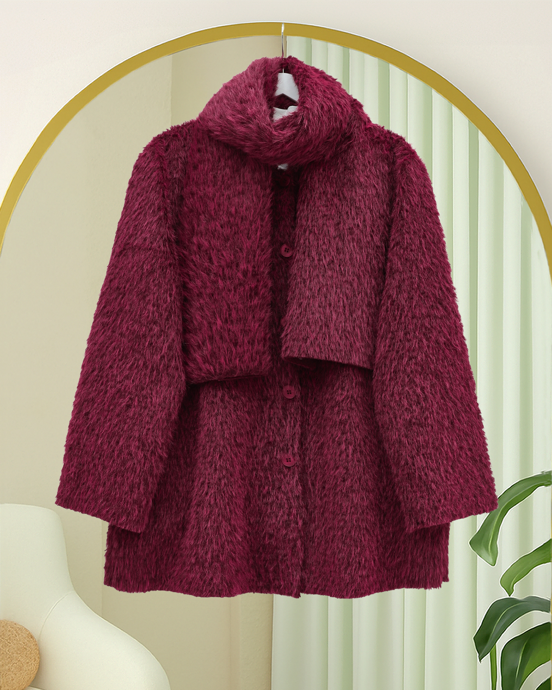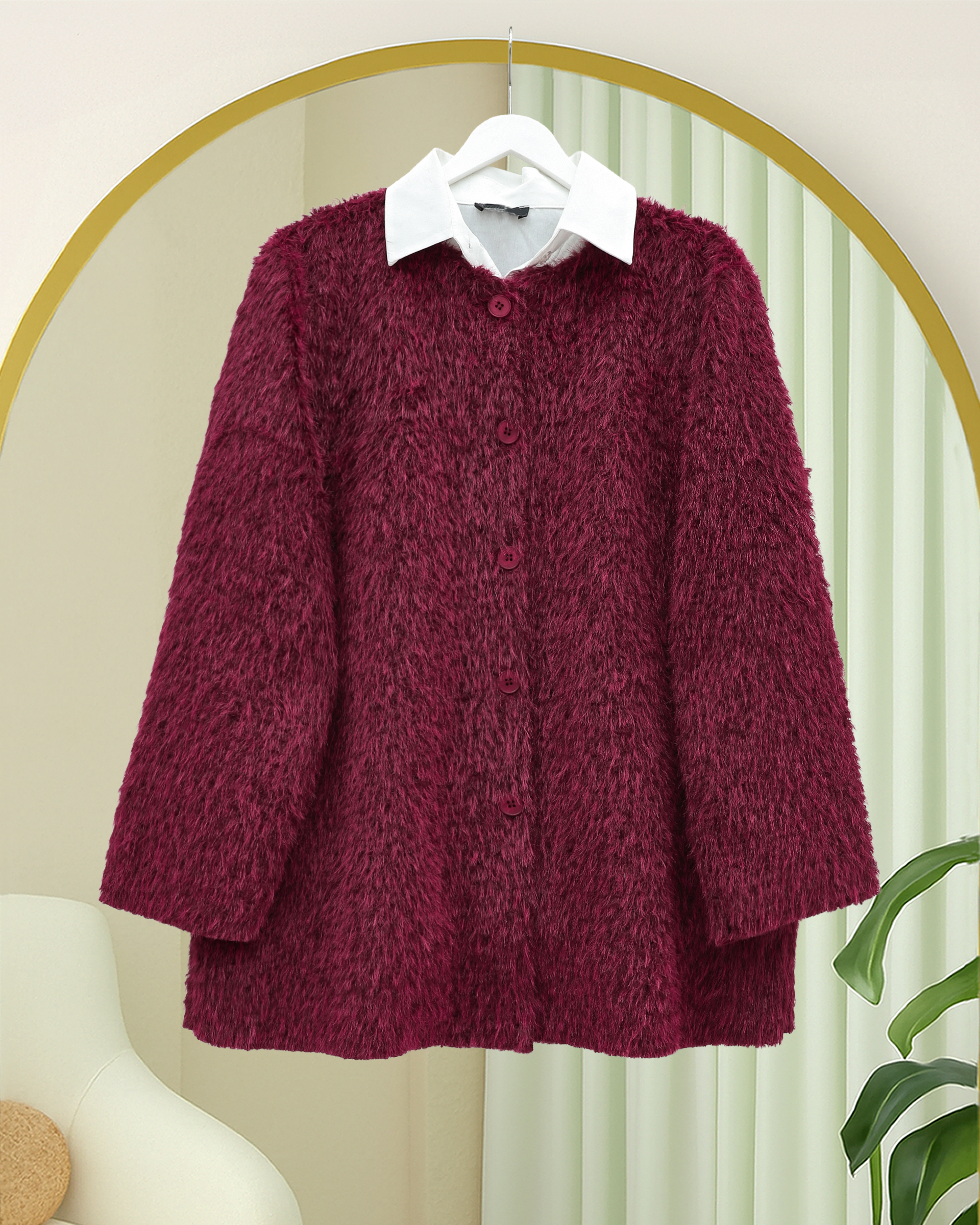 Atkı Detaylı Önü Düğmeli Sakallı Ceket -Bordo-Bordo