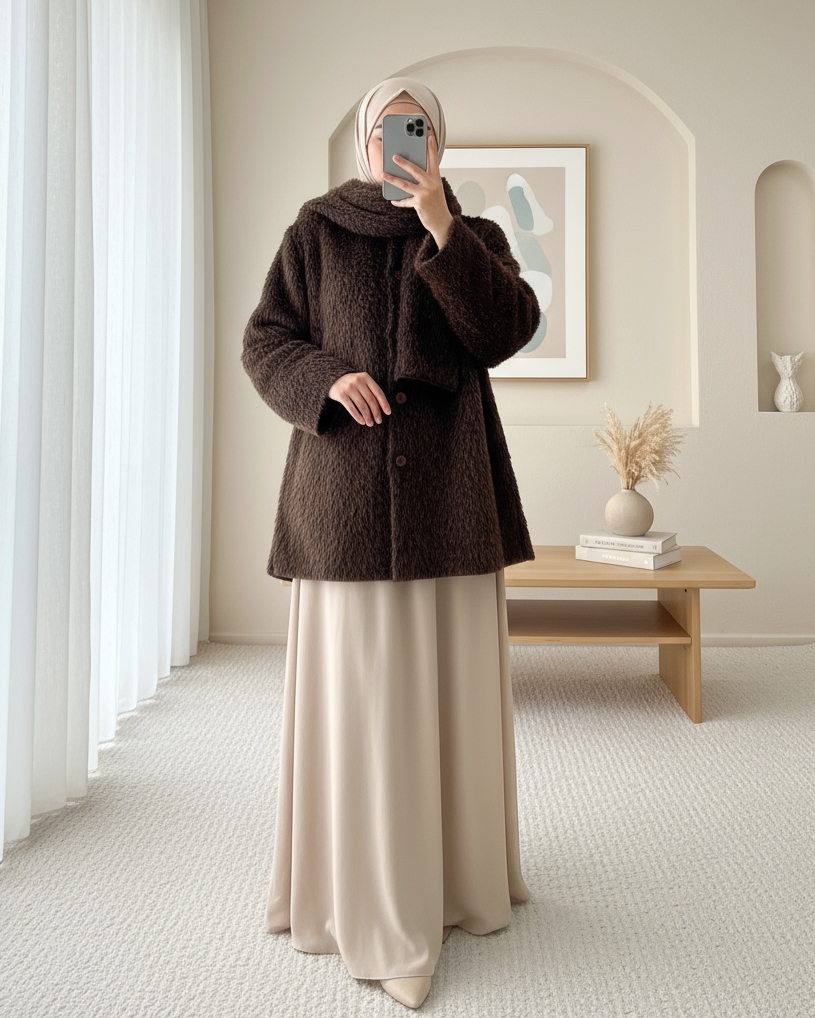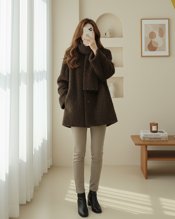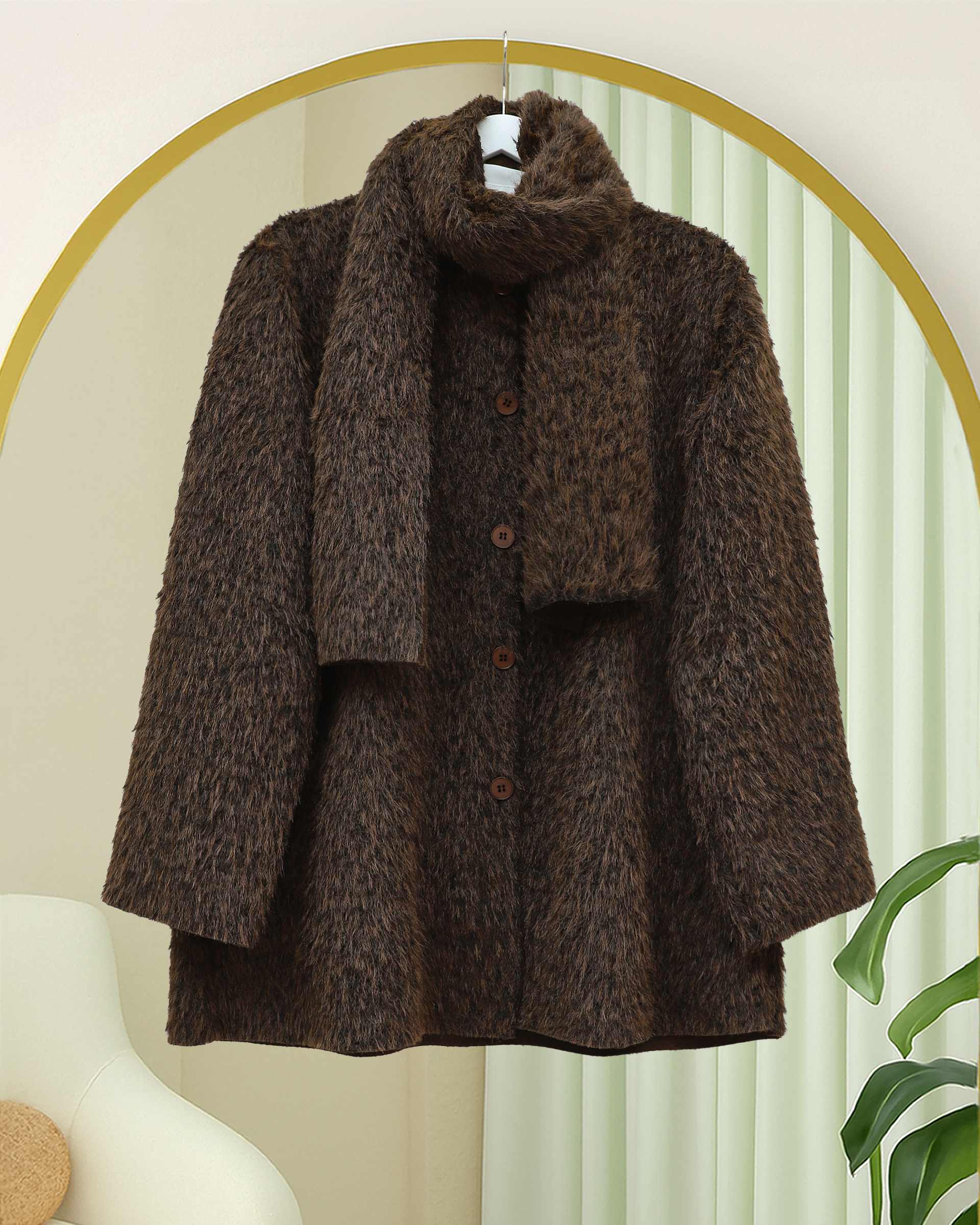 Atkı Detaylı Önü Düğmeli Sakallı Ceket -Kahve-Kahve