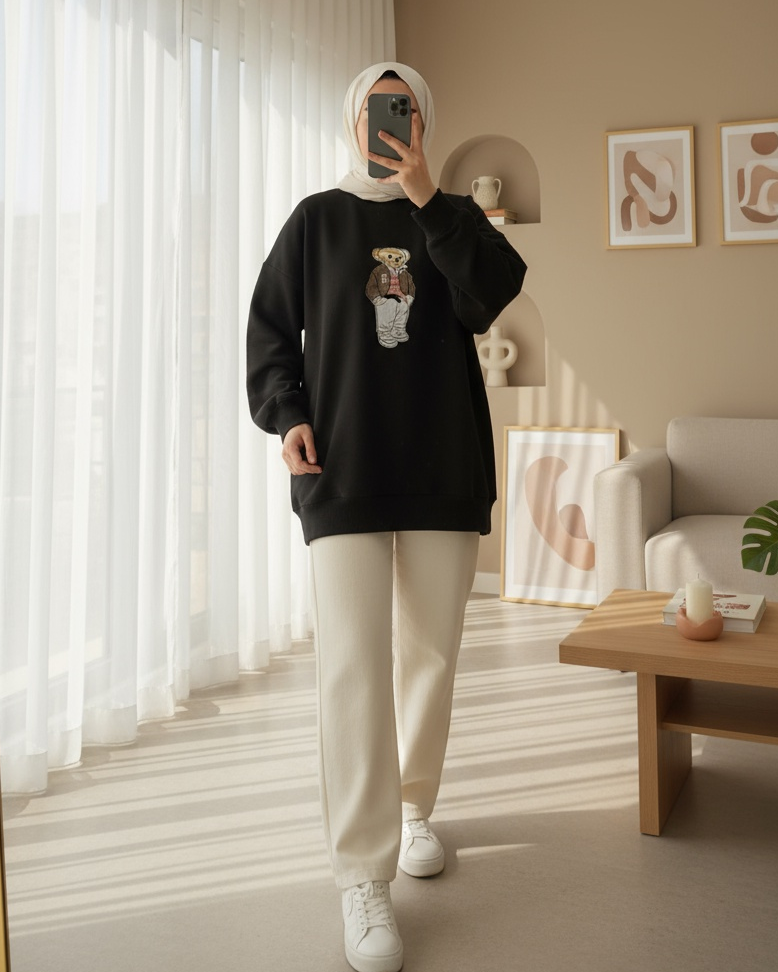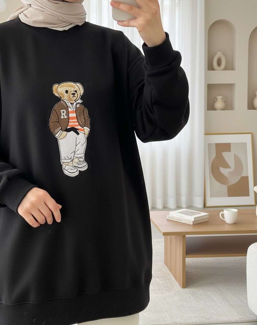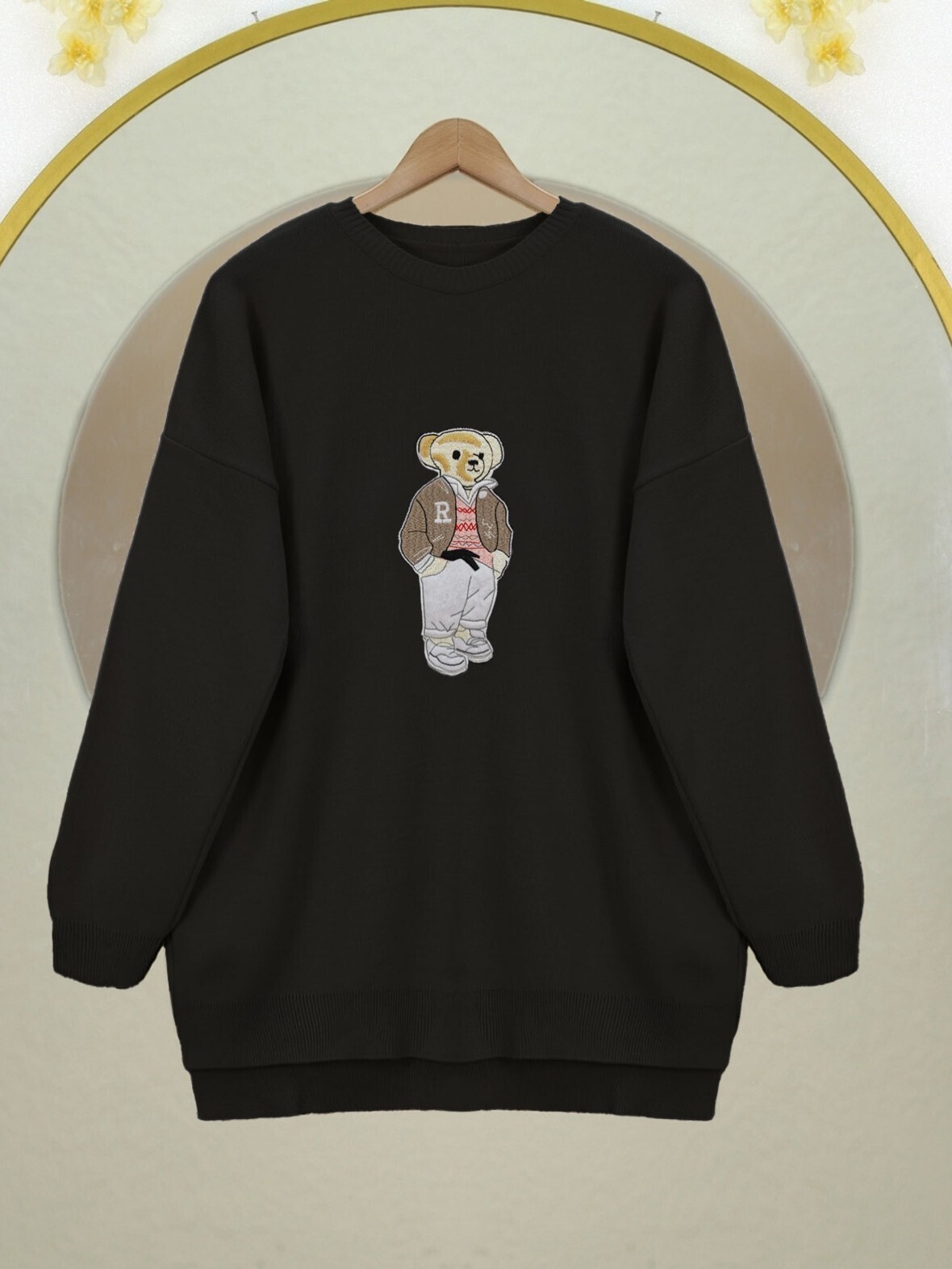 Ayıcık İşlemeli Arkası Uzun Triko Kazak -Siyah-Siyah
