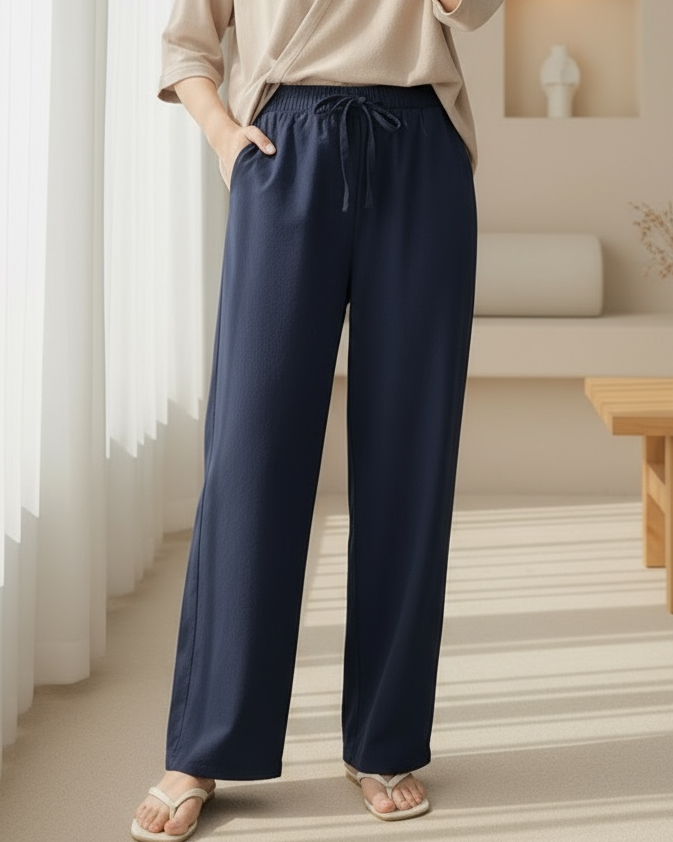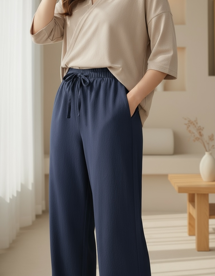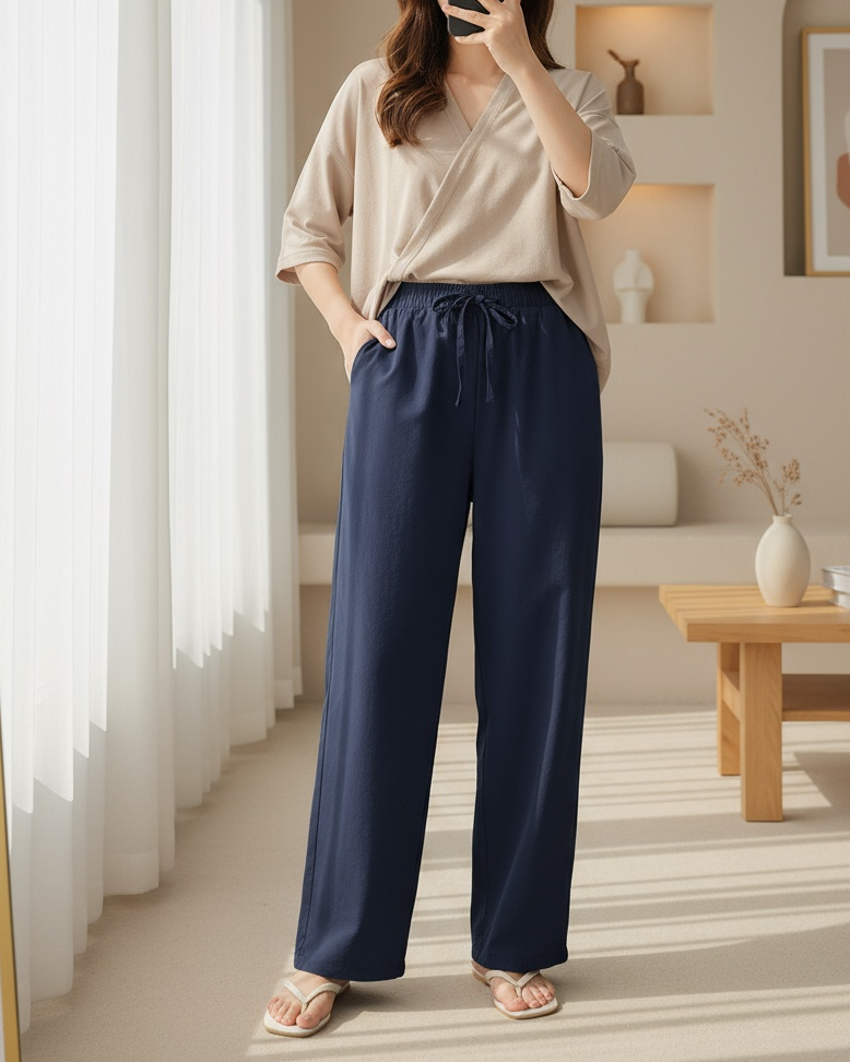 Bağcık Detaylı Bol Paça Beli Lastikli Keten Pantolon -K.Laci-K.Laci