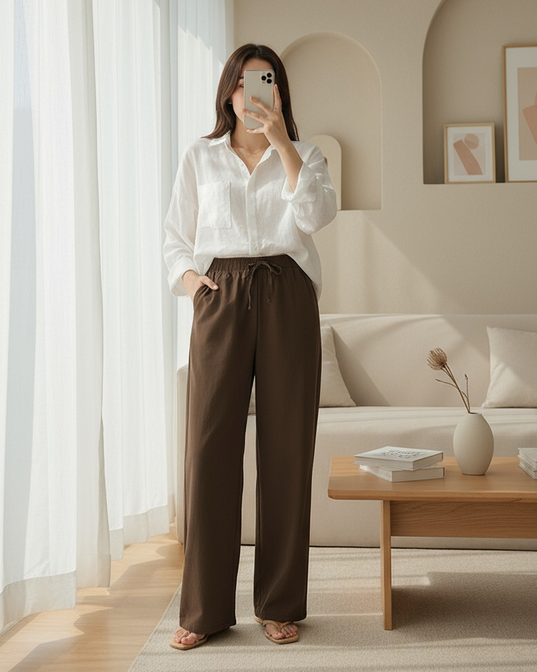 Bağcık Detaylı Bol Paça Beli Lastikli Keten Pantolon -Kahve-Kahve