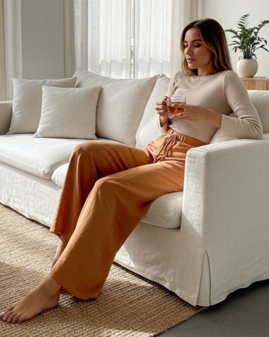 Bağcık Detaylı Bol Paça Beli Lastikli Pantolon -Kayısı Rengi-Kayısı Rengi