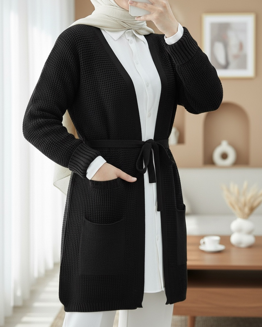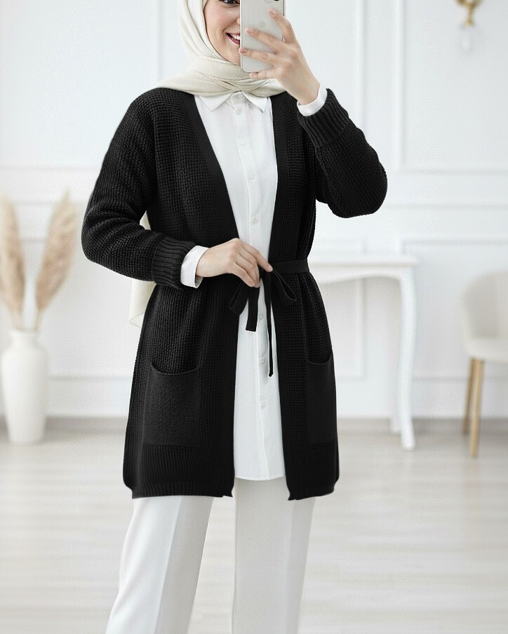 Bağcıklı Prinç Örgü Triko Hırka -Siyah-Siyah
