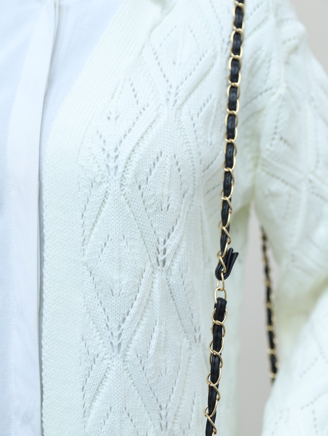 Baklava Desen Ajurlu Uzun Triko Hırka -Krem-Krem
