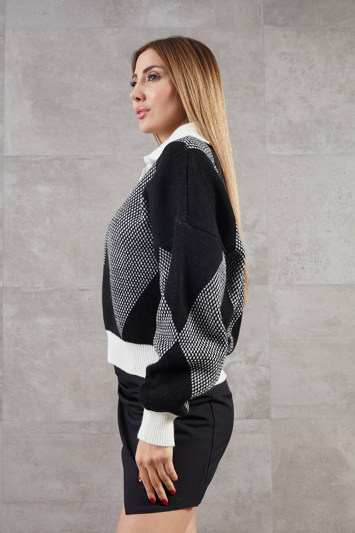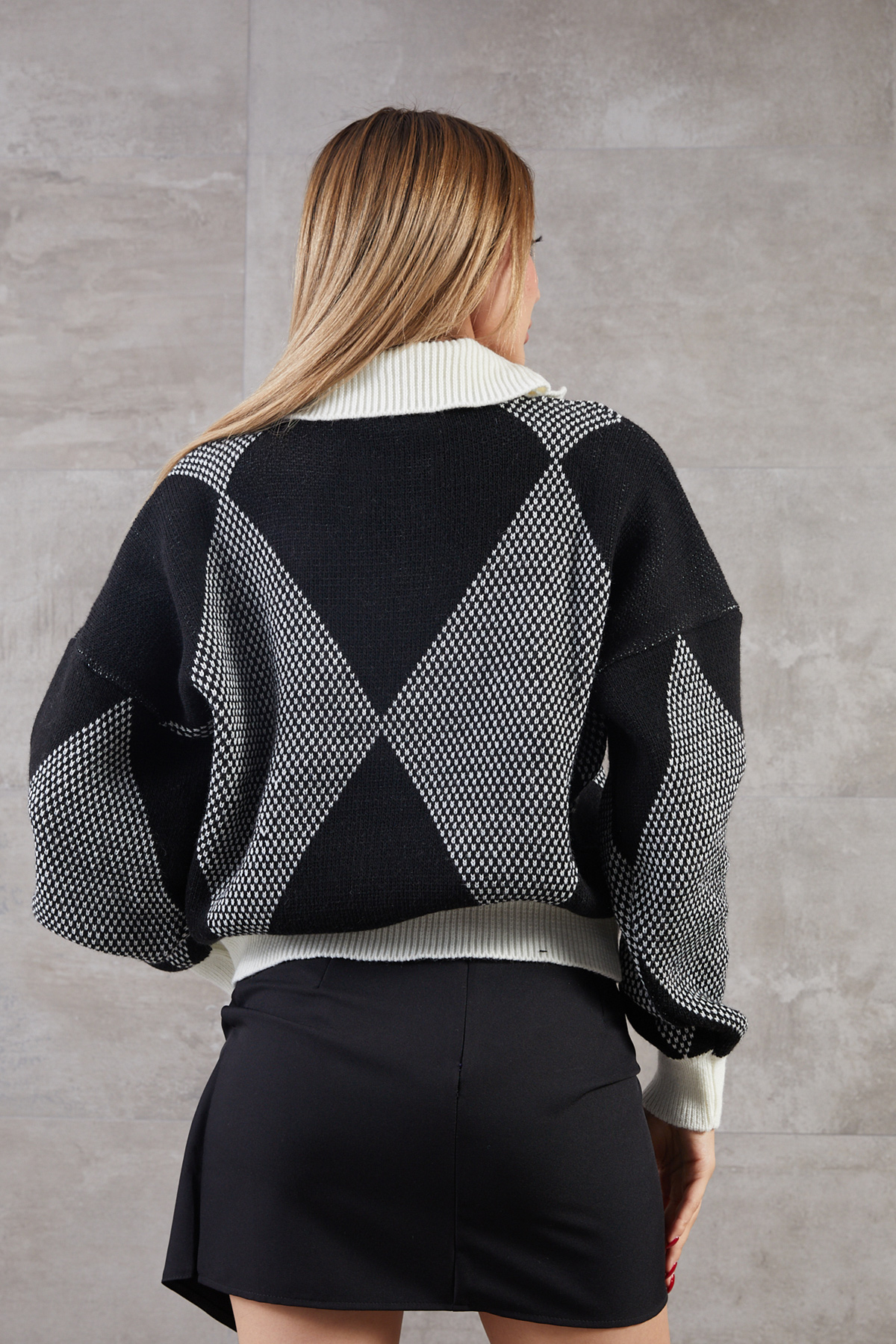 Baklava Desenli Polo Yaka Triko Kazak-Siyah