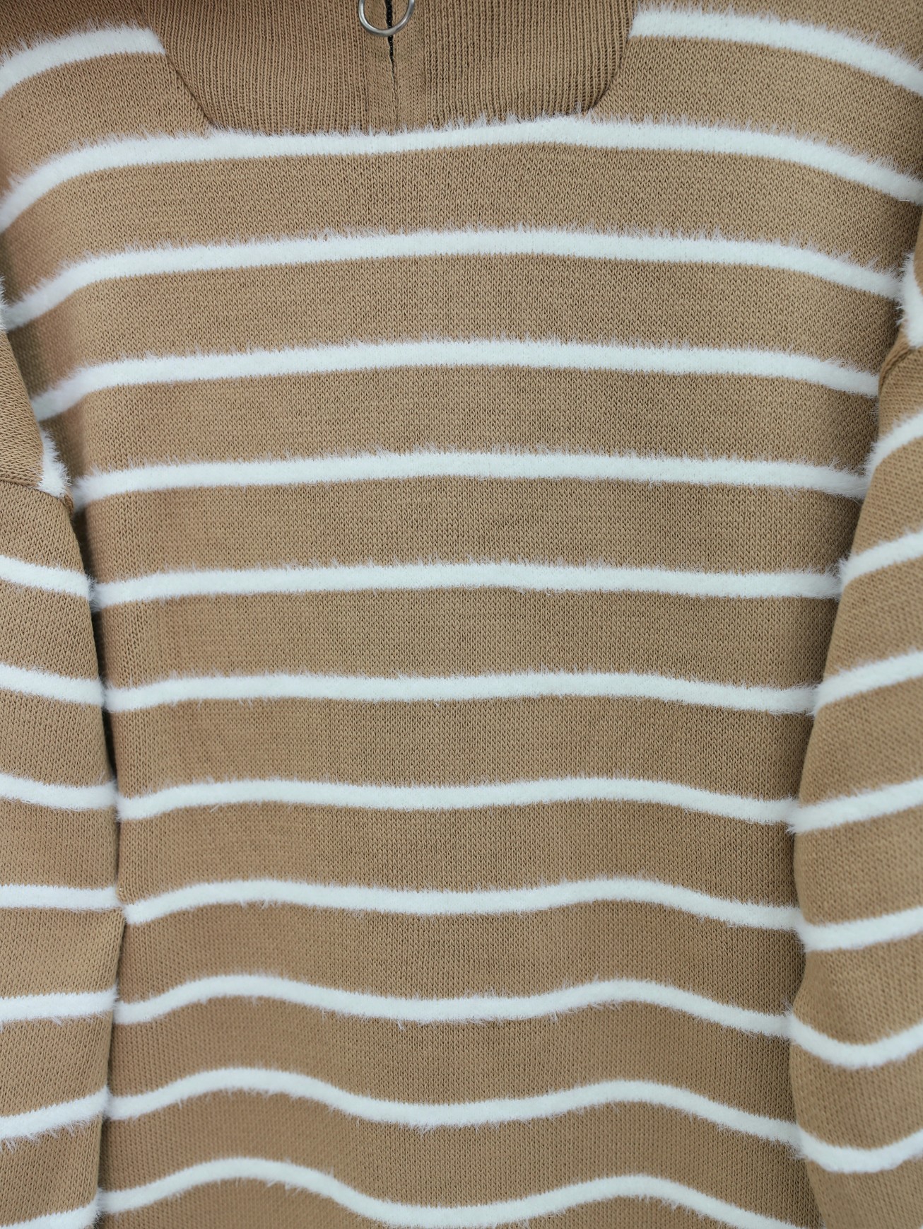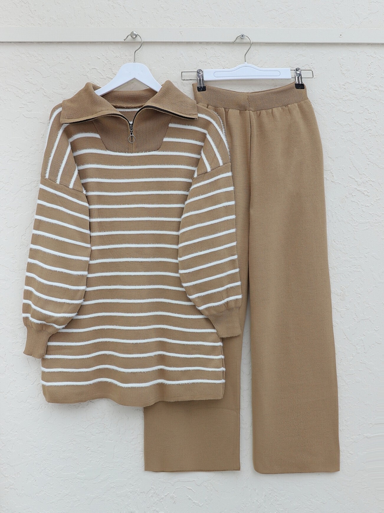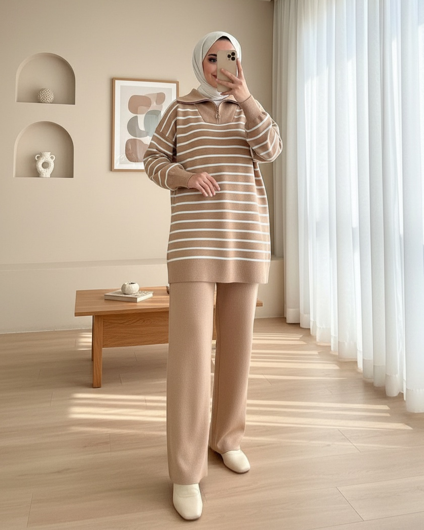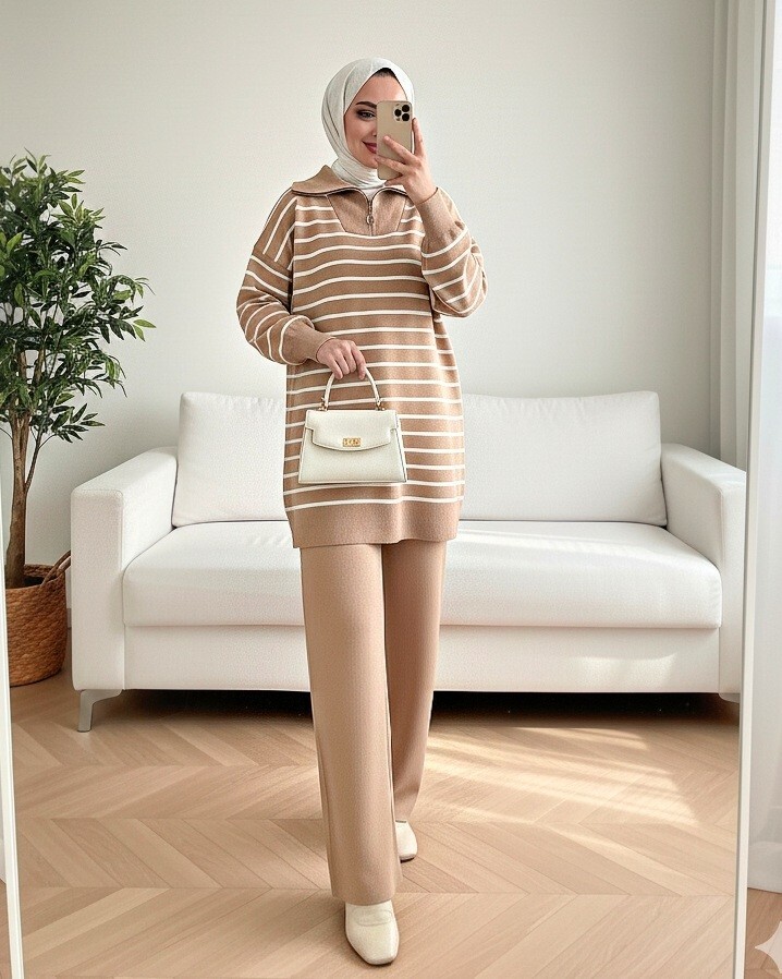 Balıkçı Yaka Fermuarlı Çizgili Triko Takım -Vizon-Vizon