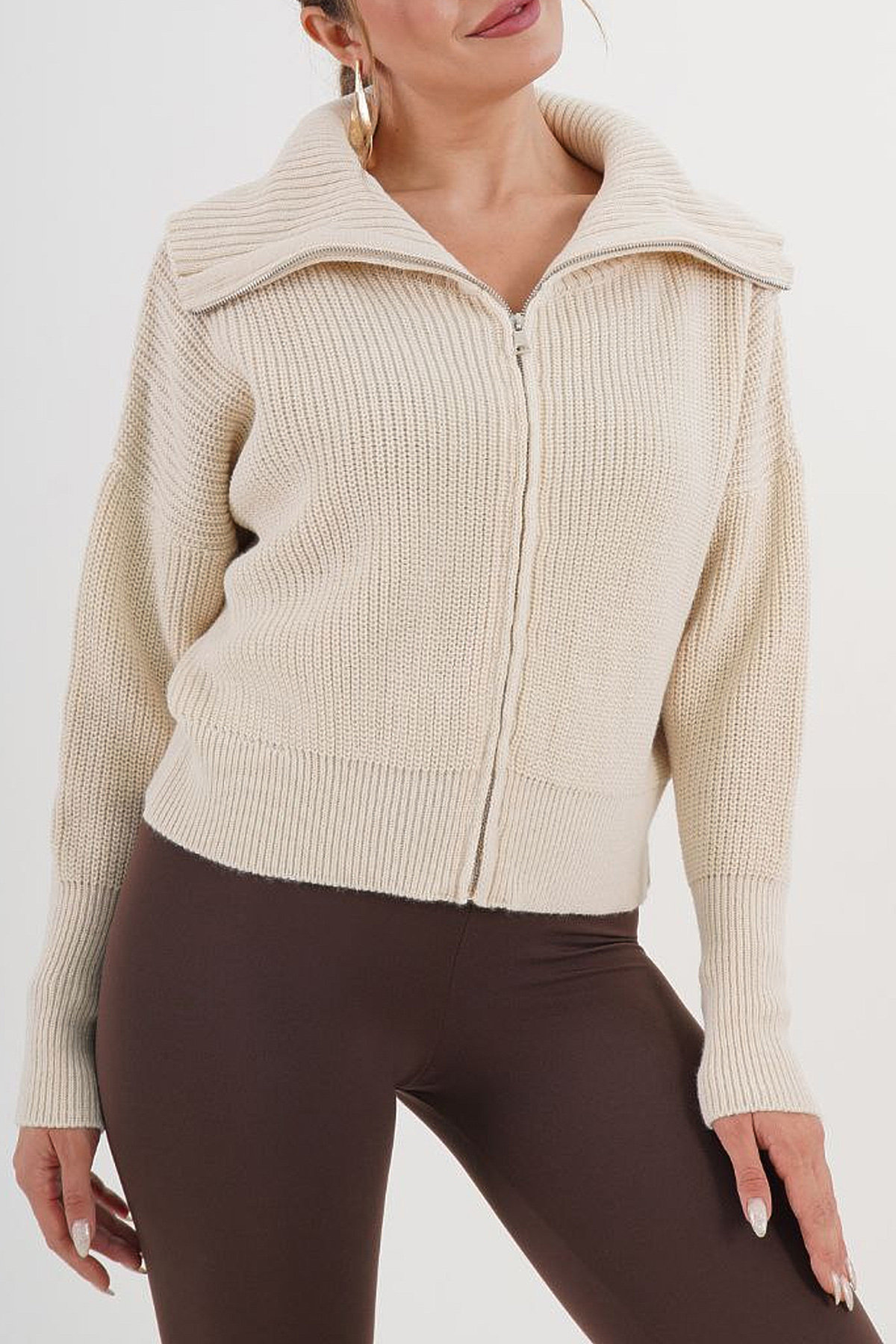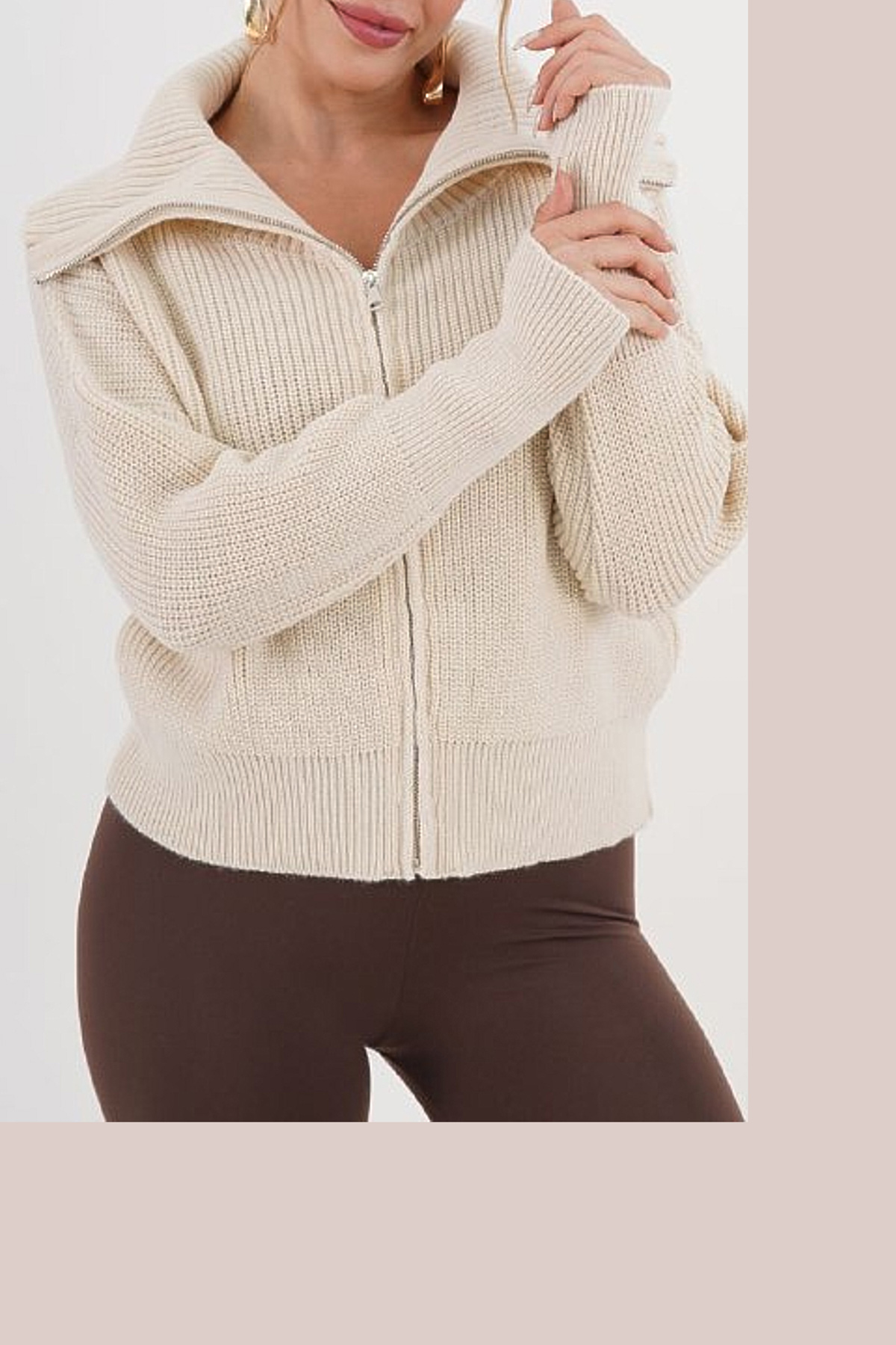 Balıkçı Yaka Fermuarlı Selanik Hırka-Bej