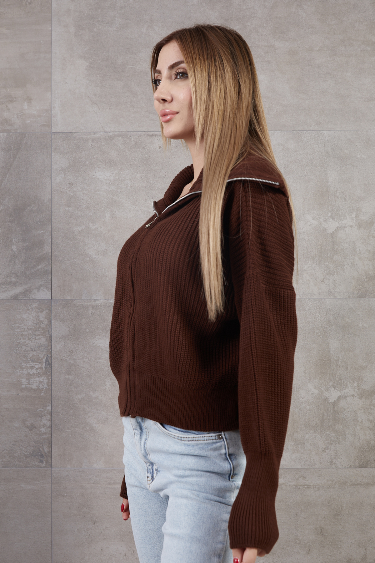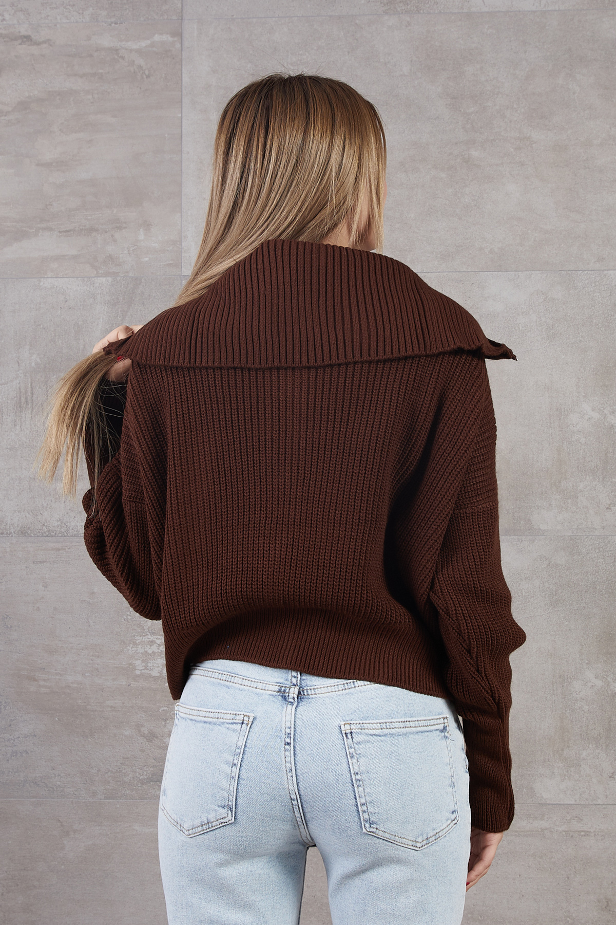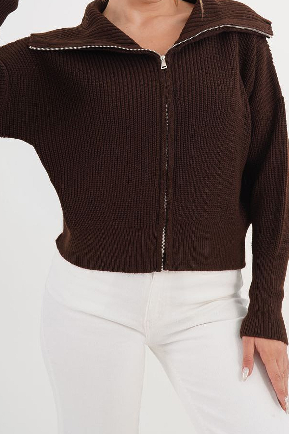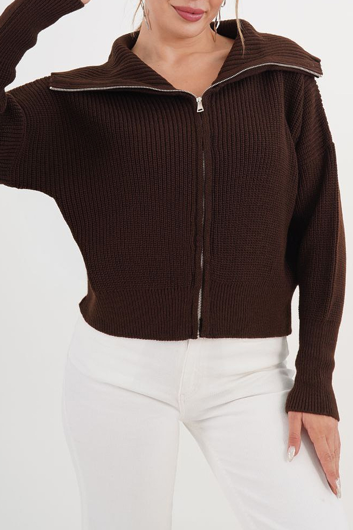 Balıkçı Yaka Fermuarlı Selanik Hırka-Kahve