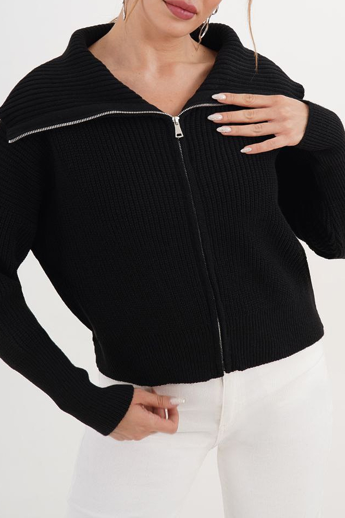 Balıkçı Yaka Fermuarlı Selanik Hırka-Siyah