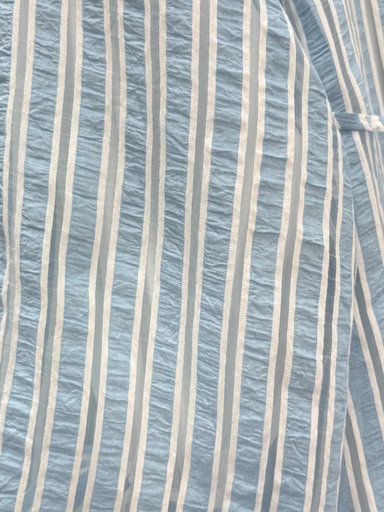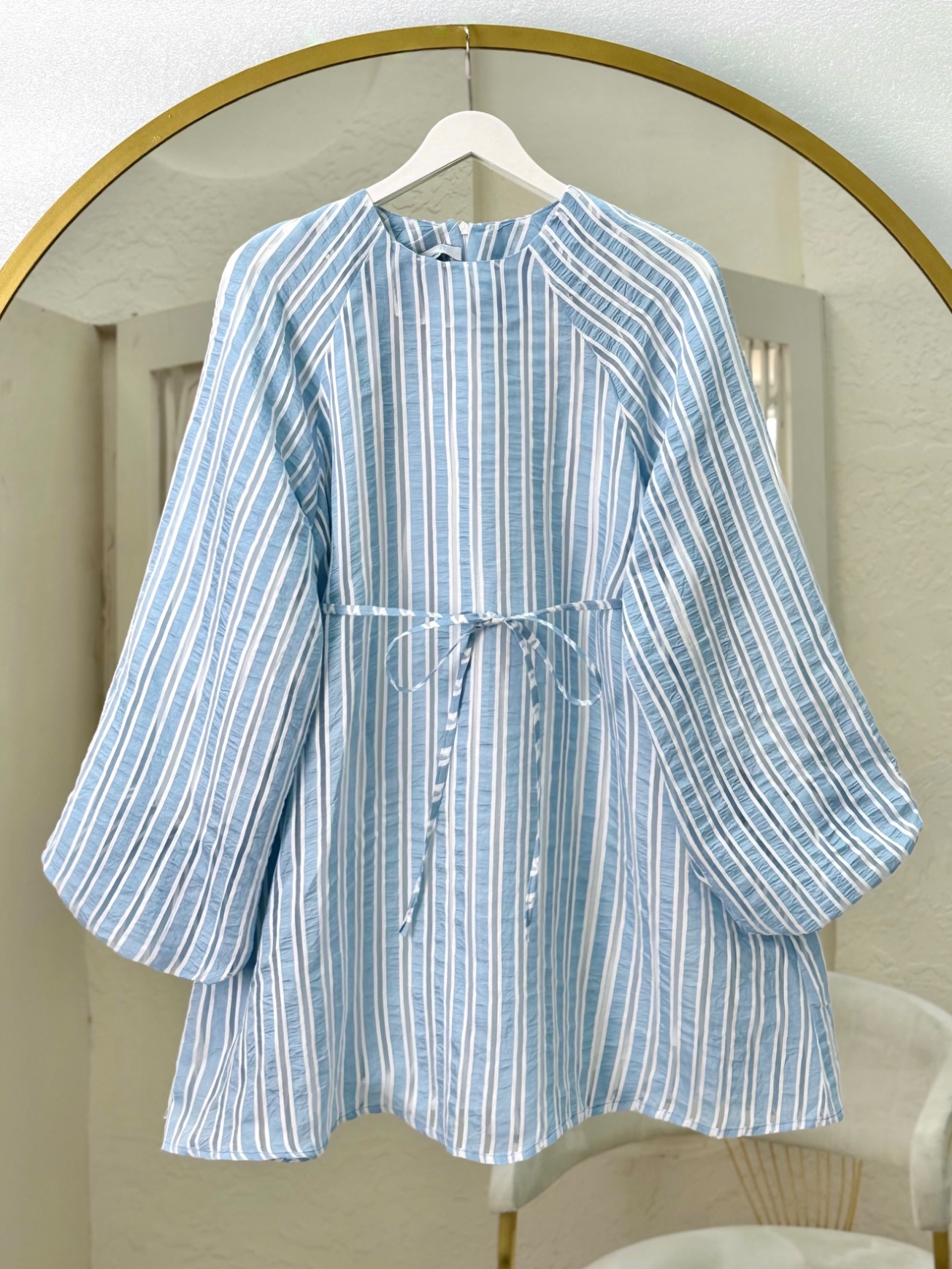 Balon Kol Belden Bağlamalı Astarlı Çizgili Tunik -Bebe Mavi-Bebe Mavi