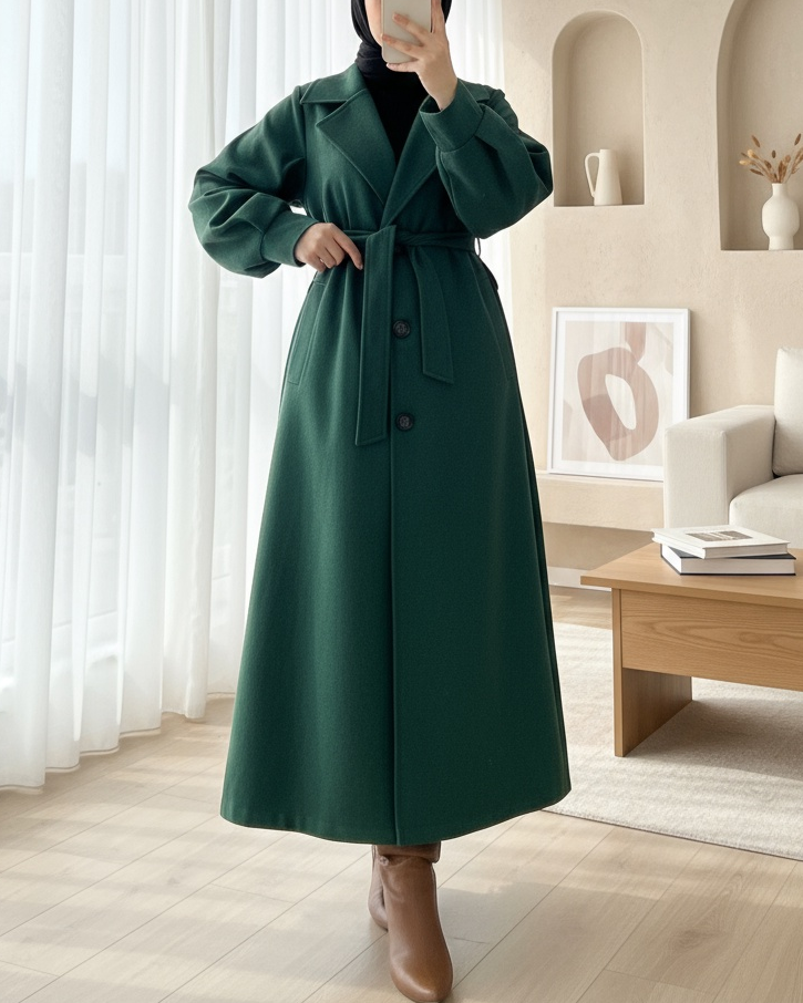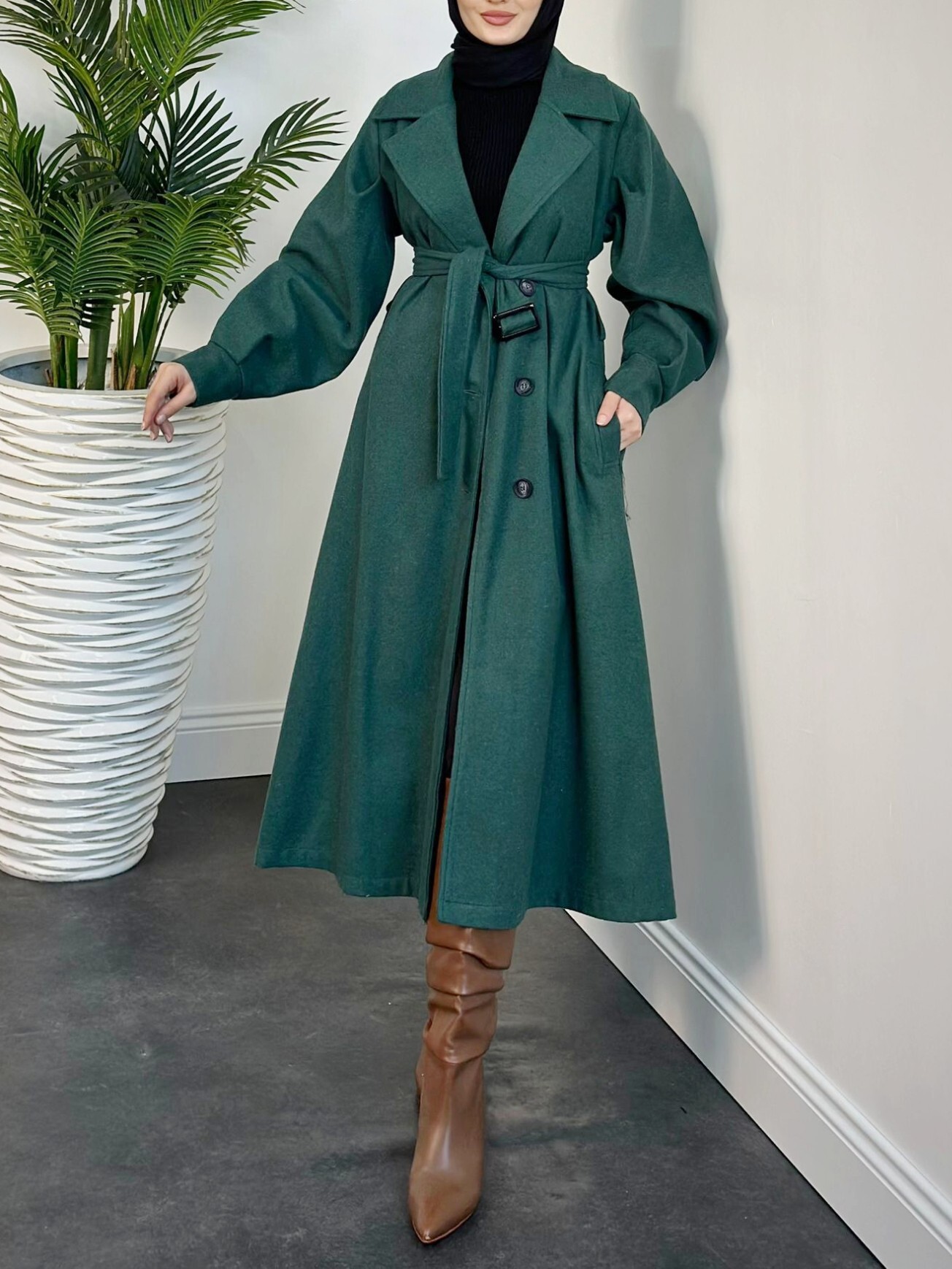 Balon Kol Kemerli Astarlı Kaşe Kaban -Zümrüt-Zümrüt