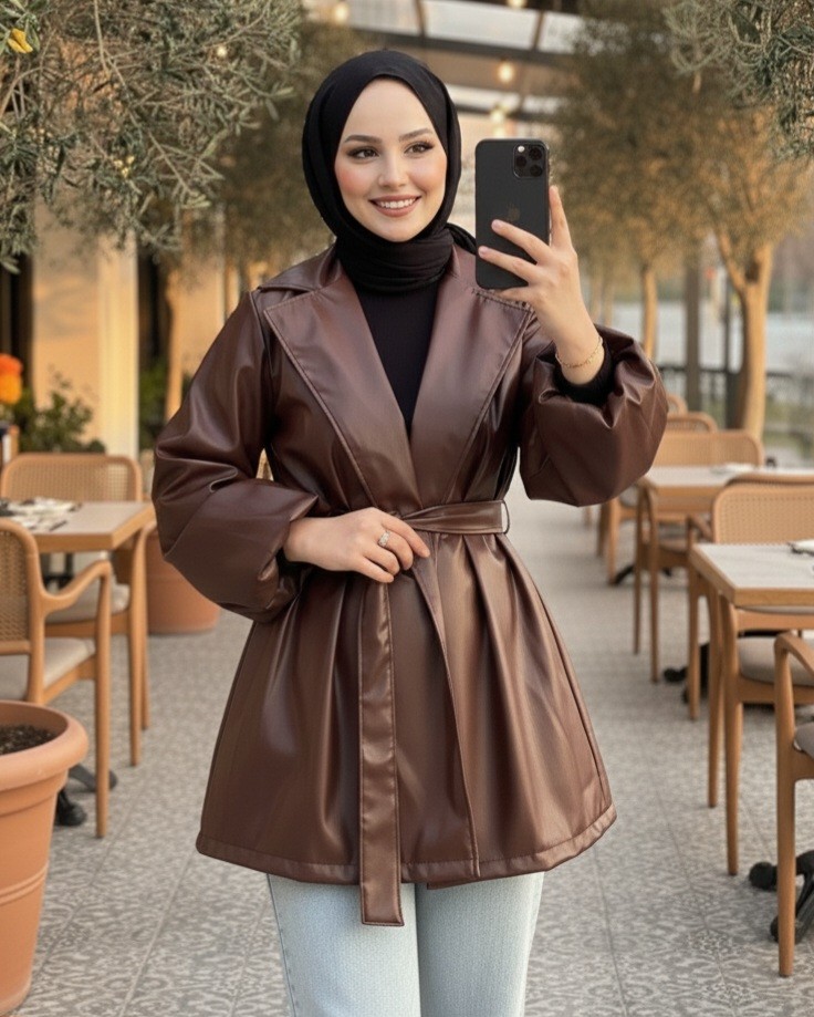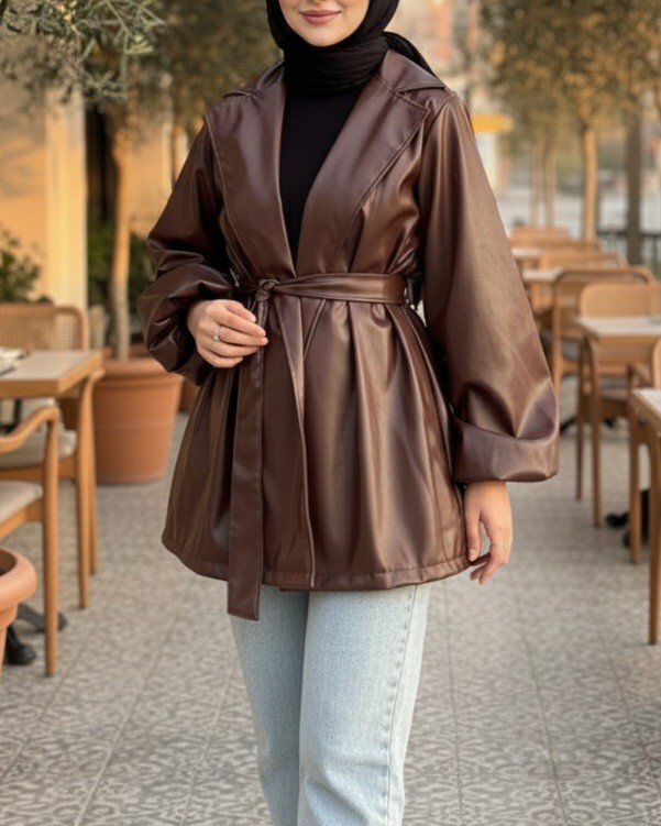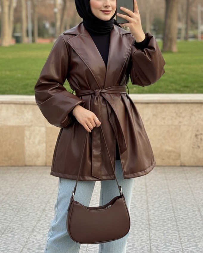 Balon Kol Kemerli Deri Ceket -Kahve-Kahve