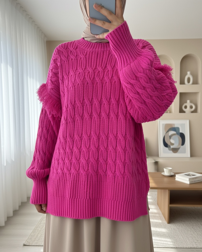 Balon Kol Püsküllü Triko Kazak -Fuşya-Fuşya