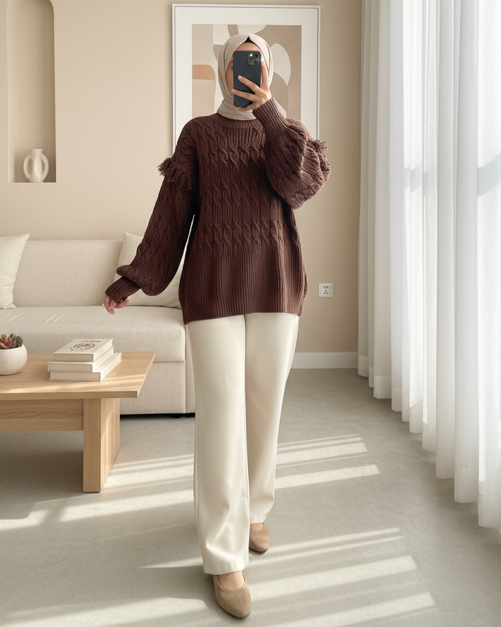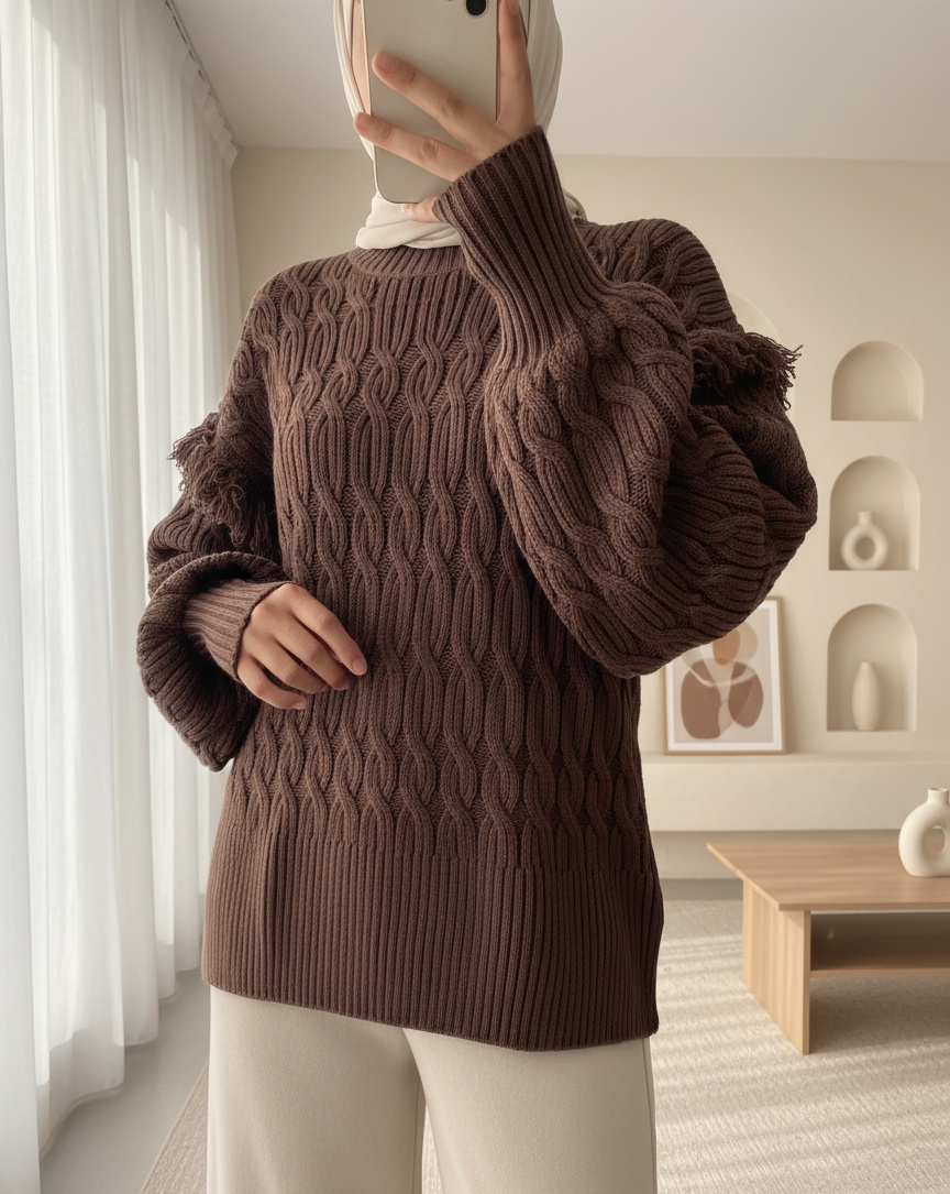 Balon Kol Püsküllü Triko Kazak -Kahve-Kahve
