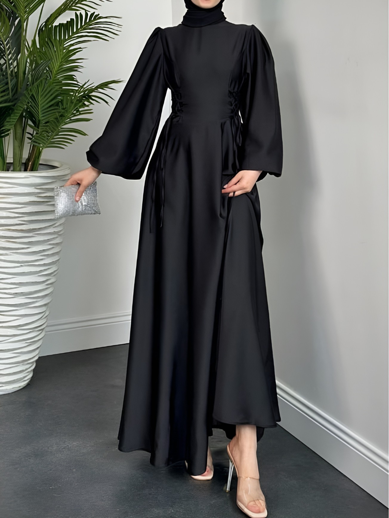Balon Kol Yandan Bağcıklı Saten Elbise -Siyah-siyah