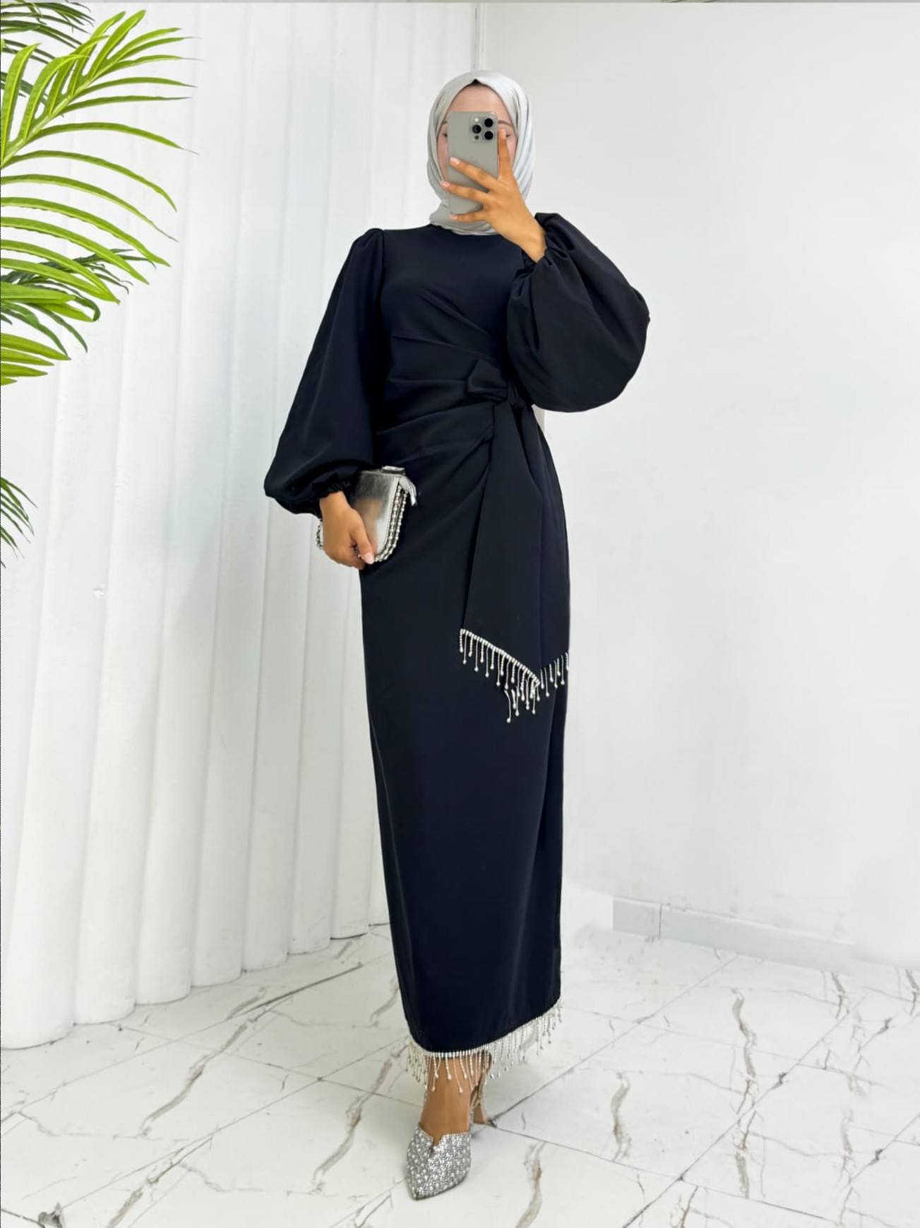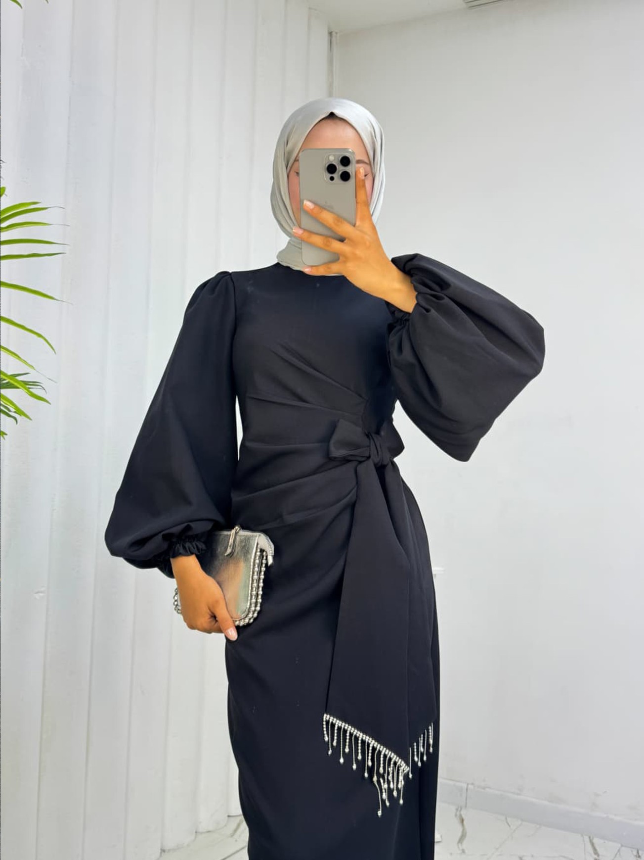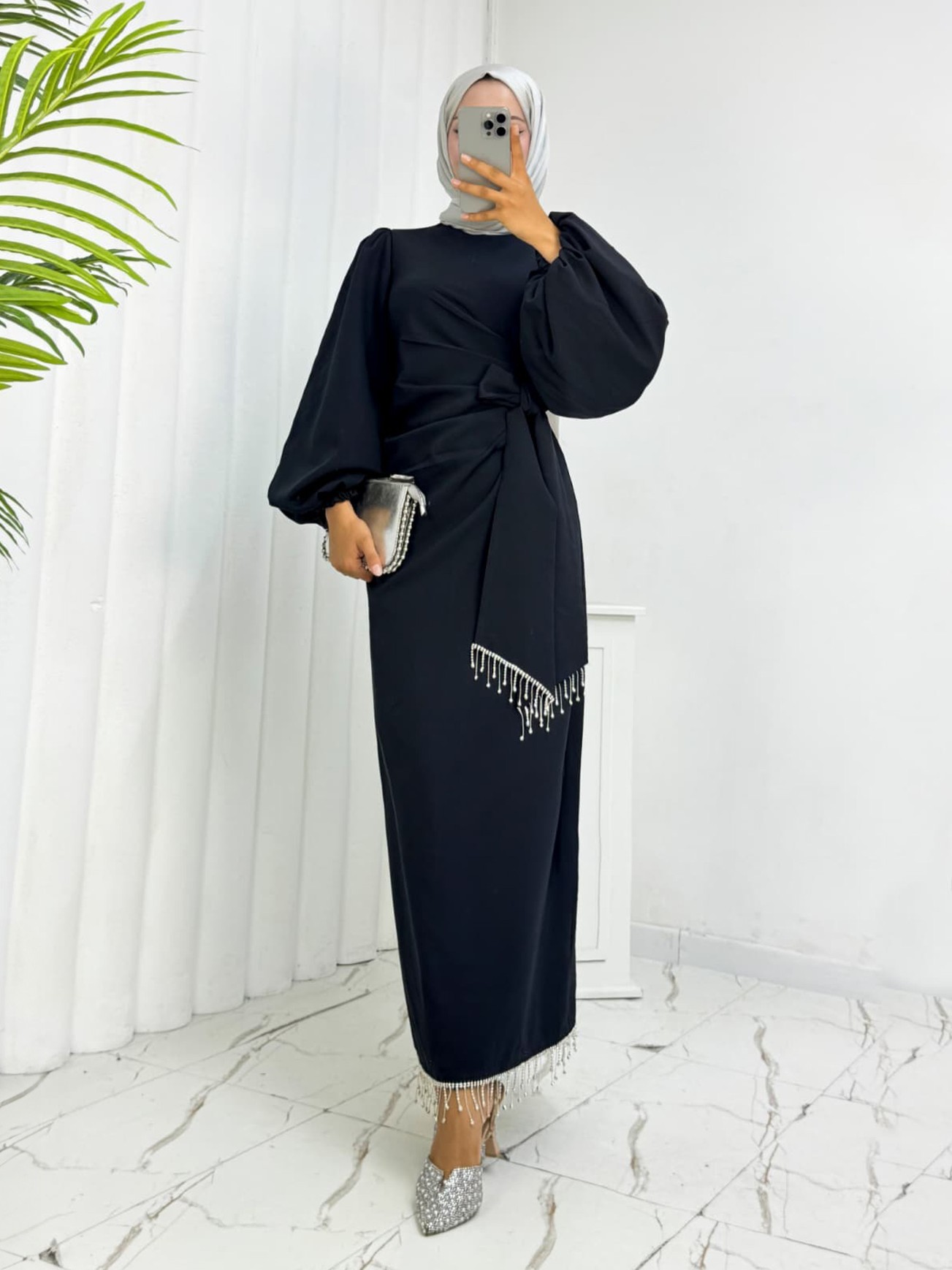 Balon Kol Yandan Bağlamalı Taş Püsküllü Krep Elbise -Siyah-siyah