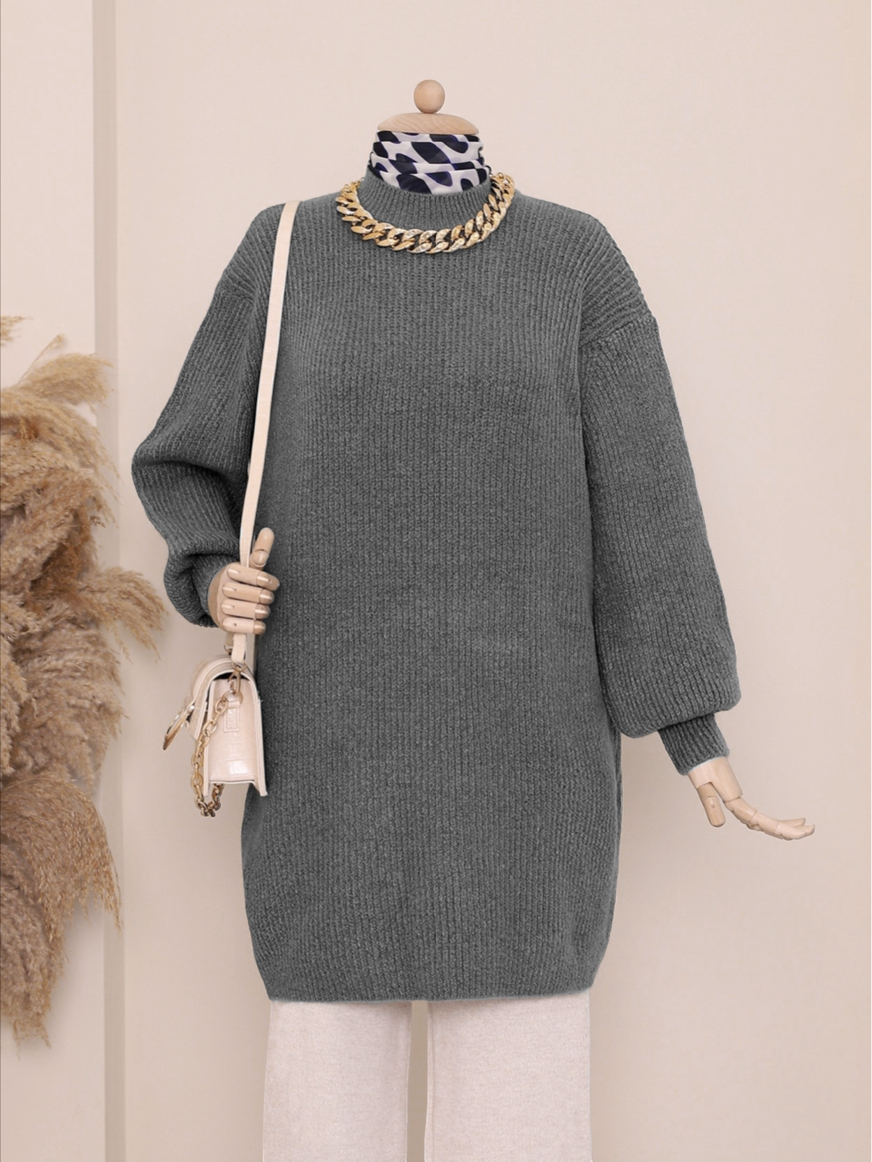 Balon Kol Yumoş Örme Triko Tunik -Füme-Füme