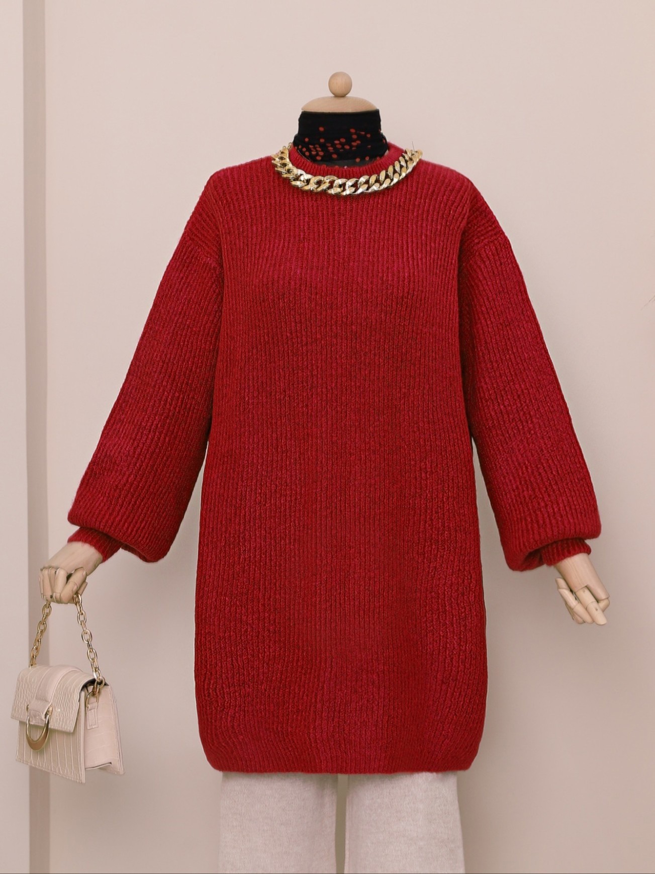 Balon Kol Yumoş Örme Triko Tunik -Kırmızı-Kırmızı