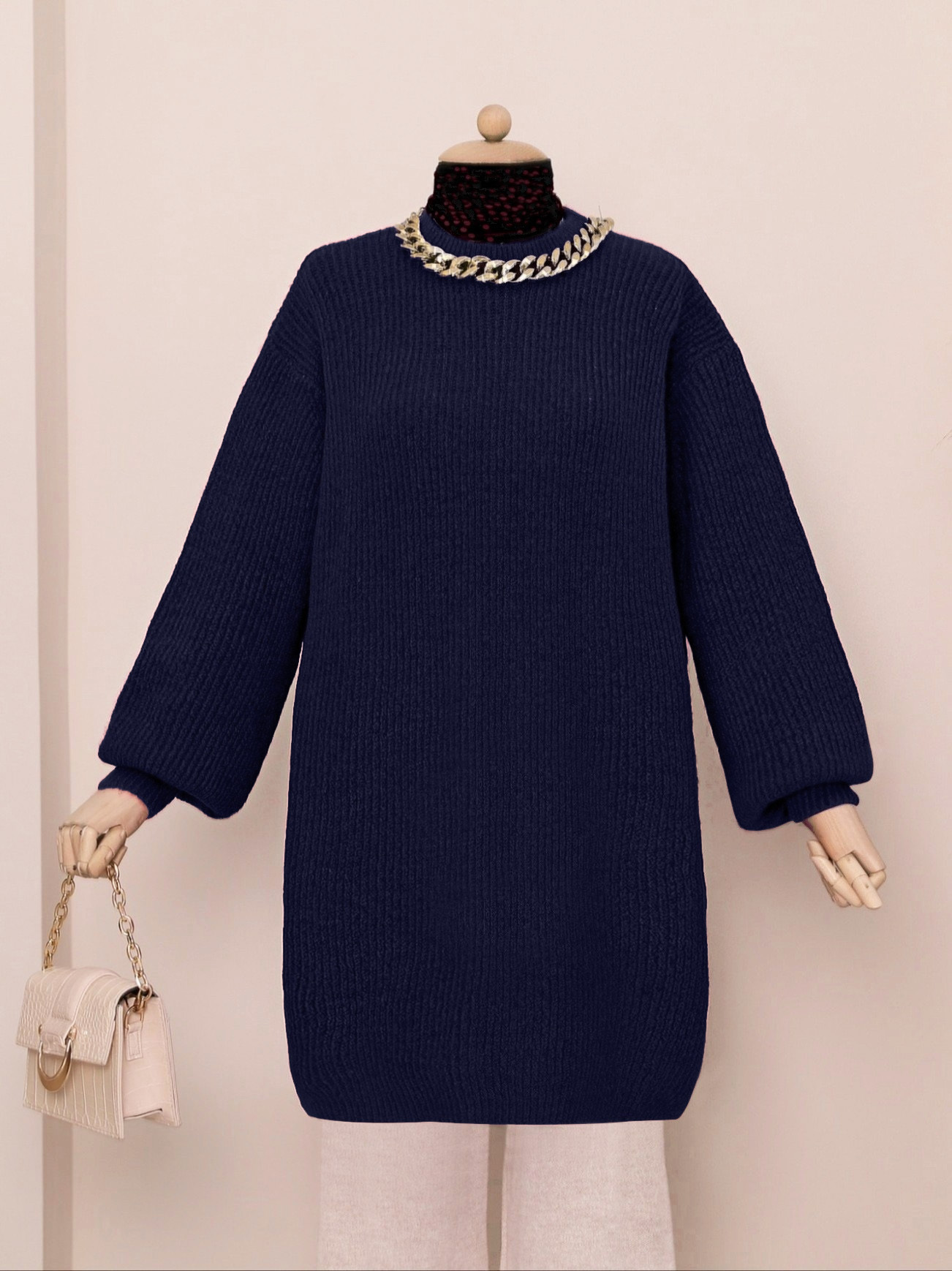 Balon Kol Yumoş Örme Triko Tunik -Laci-Lacivert
