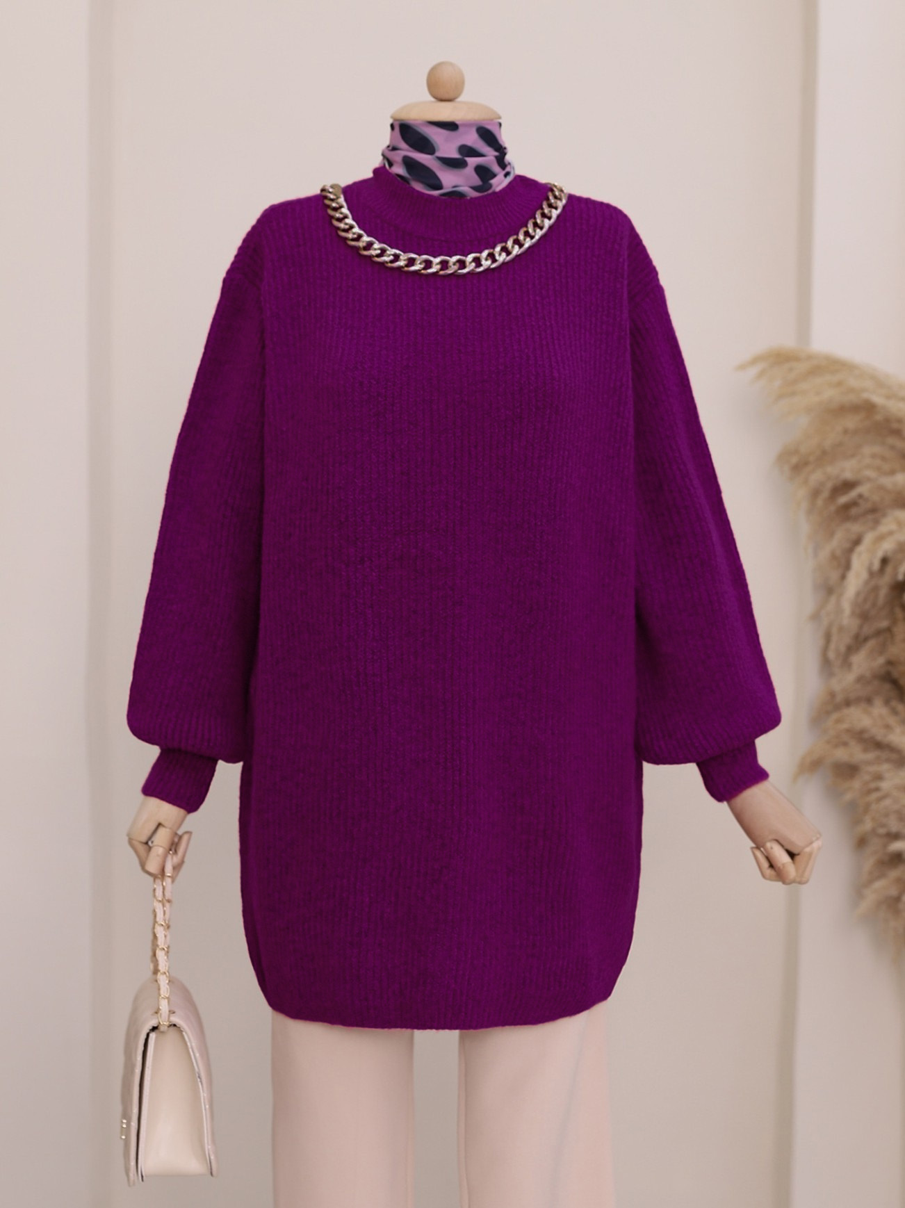 Balon Kol Yumoş Örme Triko Tunik -Mürdüm-Mürdüm