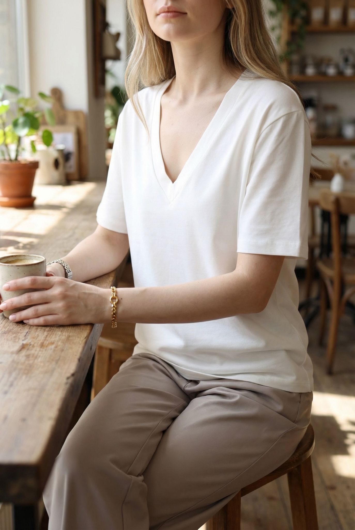 Basic V Yaka Tişört Ekru - 11340-Ekru