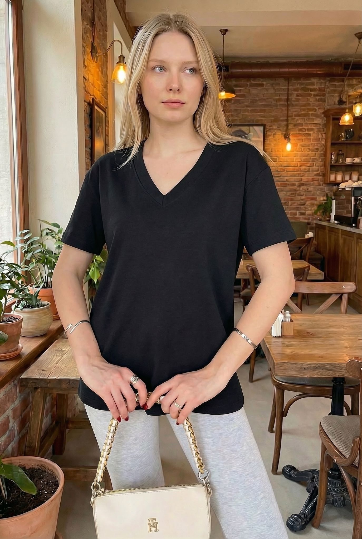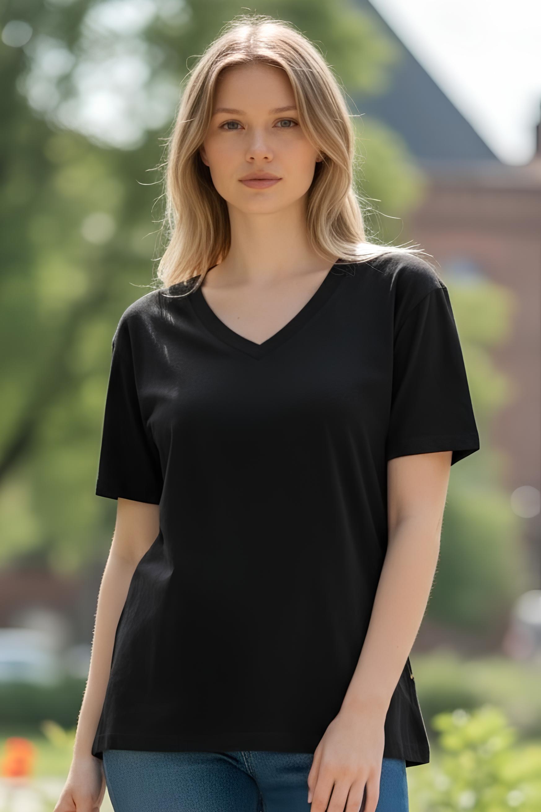 Basic V Yaka Tişört Siyah - 11340-Siyah