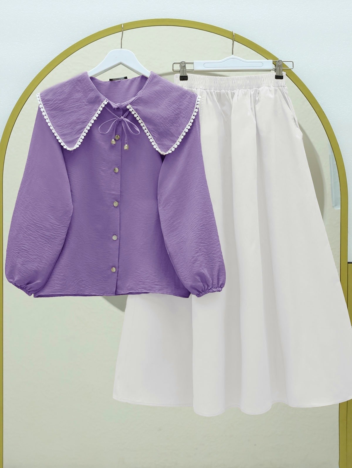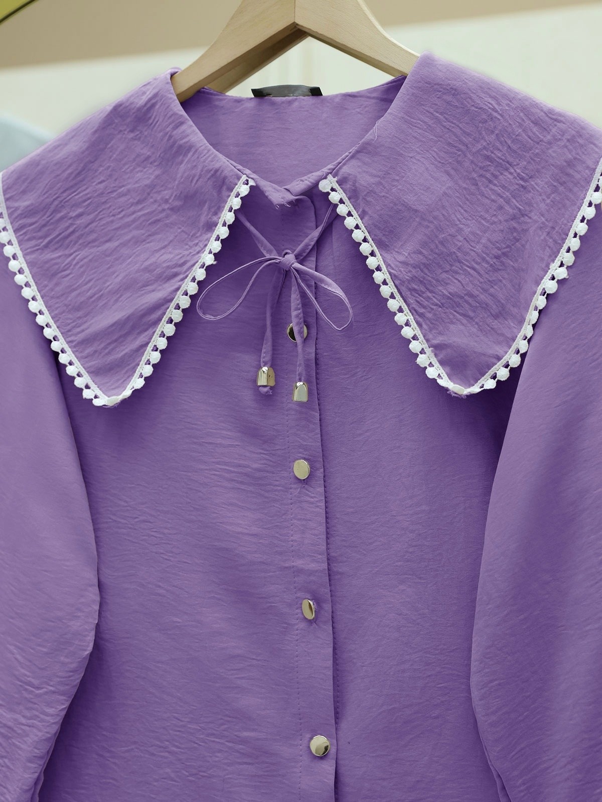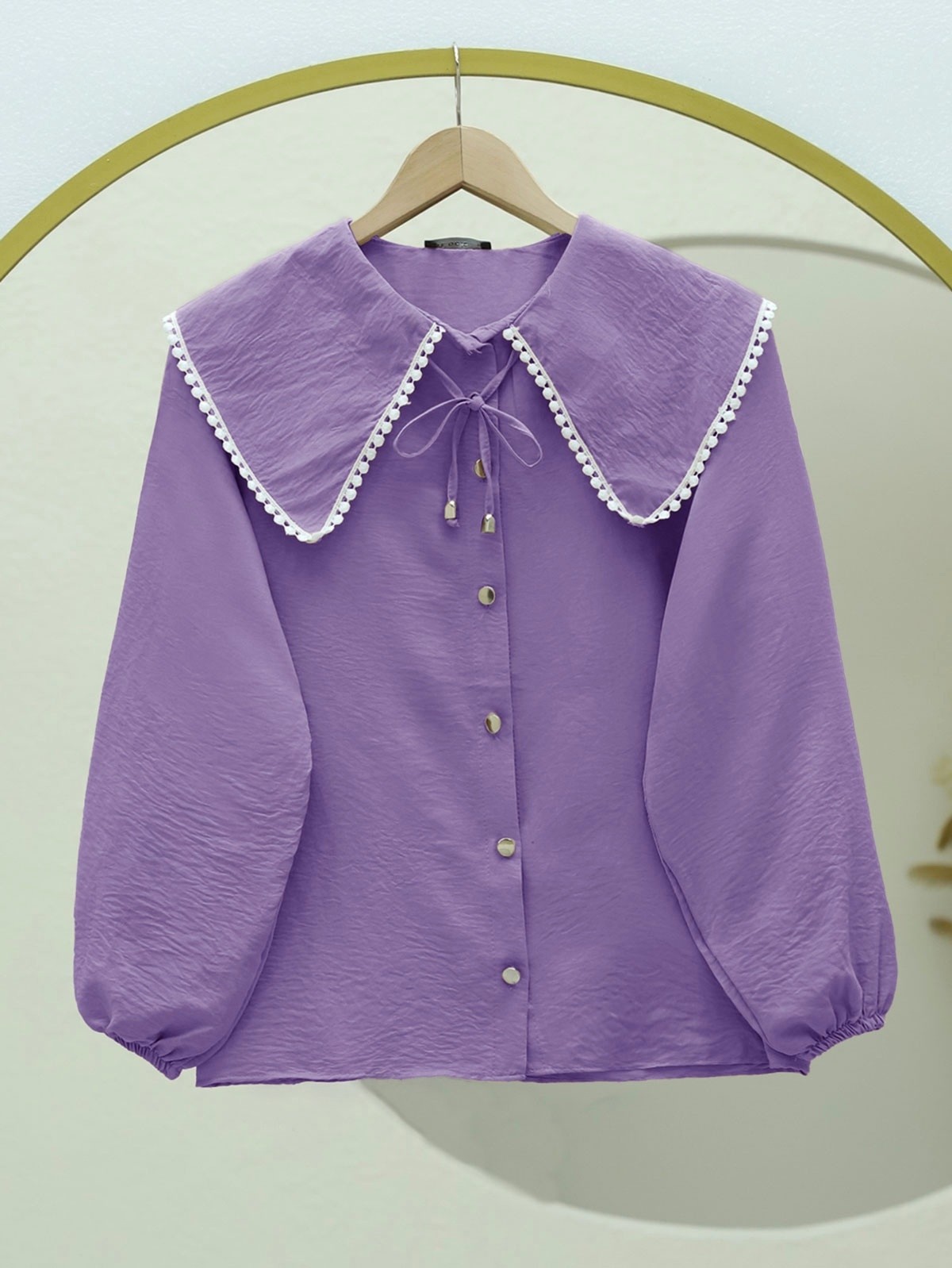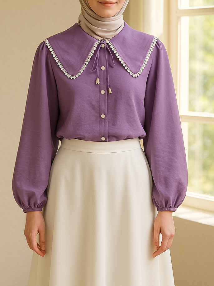 Bebe Yaka Dantelli Kolu Lastikli Gömlek -Lila-Lila