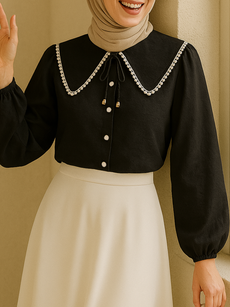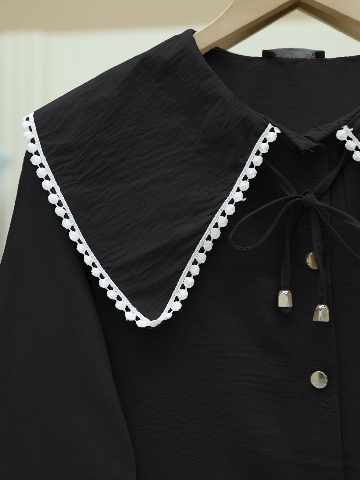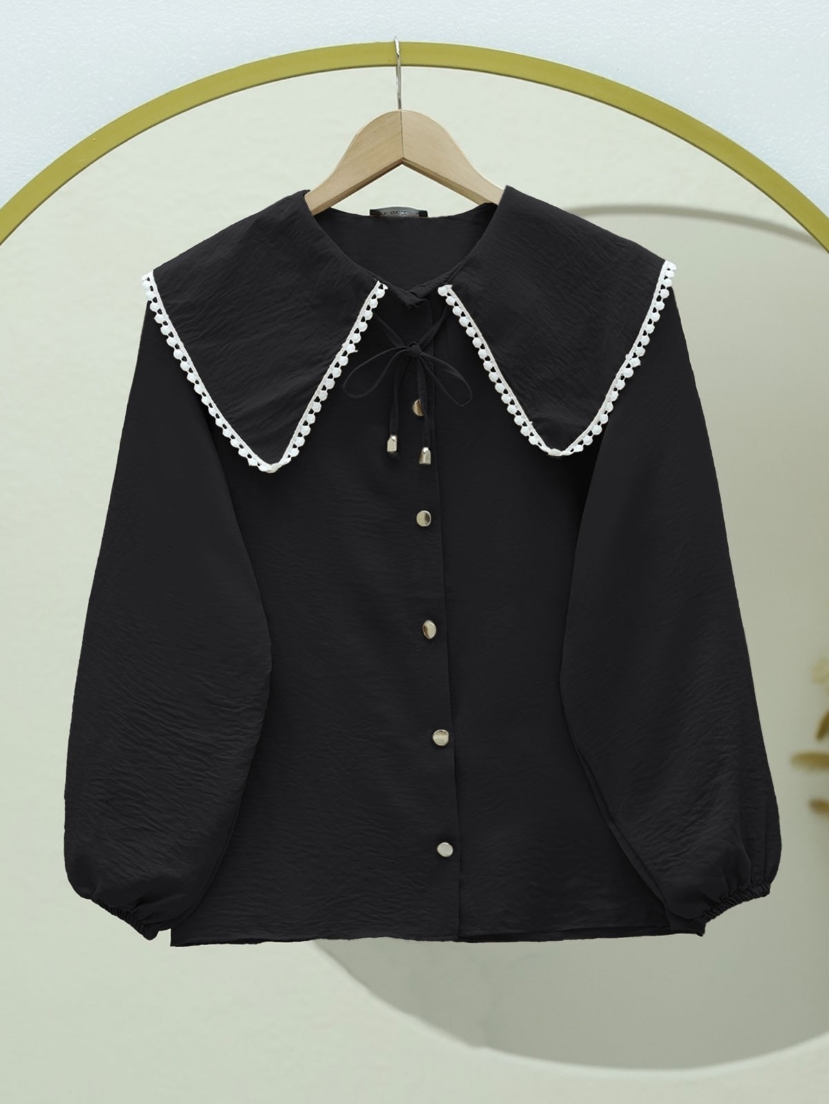 Bebe Yaka Dantelli Kolu Lastikli Gömlek -Siyah-siyah